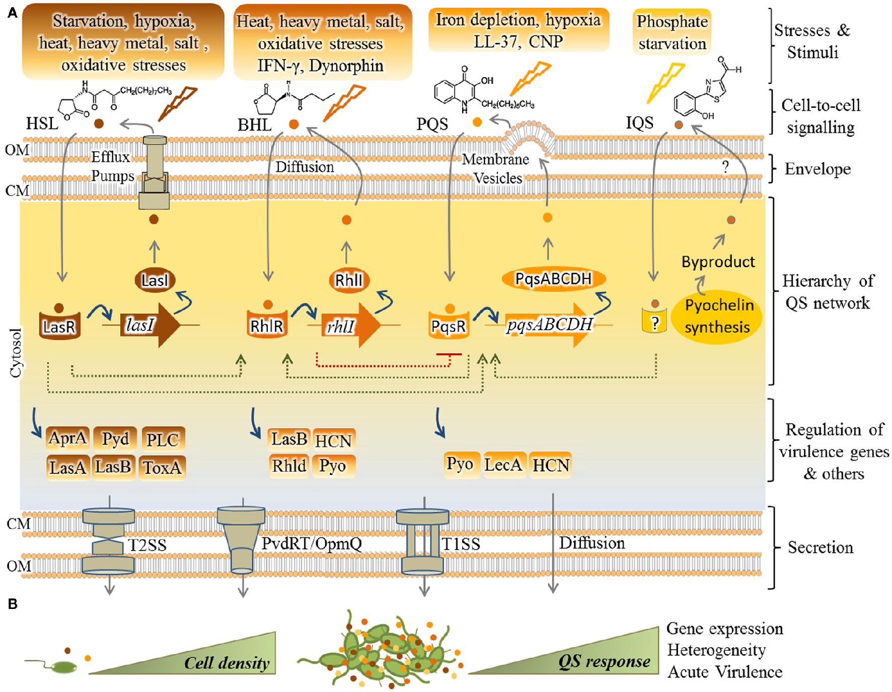 Pathogenesis encompasses various stresses such as host immune factors, bacterial interspecies competition, phosphate/iron depletion and starvation. QS systems and production of some virulence factors mediate appropriate responses to these stresses to promote survival and adaptation (García-Contreras et al., 2015). Here, we provide some examples of stress responses mediated by the QS systems.