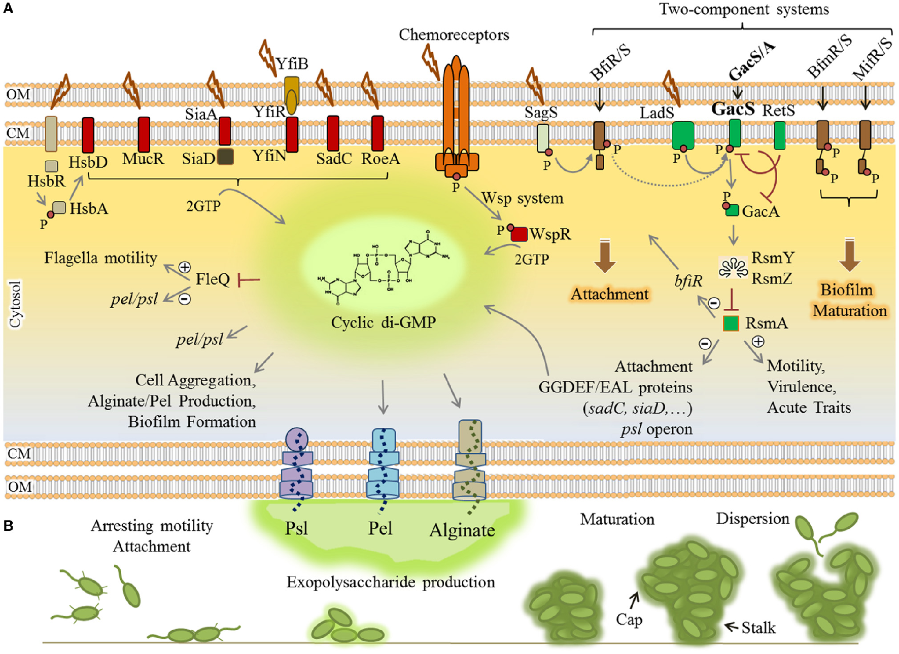 Regulatory networks underlying biofilm formation by P. aeruginosa. (A) Elevation of the cyclic di-GMP molecule is a key determinant for the motility-sessility switch. Environmental cues are sensed by various proteins localized in the envelope of the cells where these proteins contribute to two-component systems (brown/green rectangles), chemoreceptor-like system (orange complex) and other receptor mediated signaling pathways (arranged in the left side of figure). Either triggered as phosphorylation cascades (small red circle) or protein-protein interactions, the signals induce diguanylate cyclases (containing GGDEF motif) (red rectangles) to synthesize cyclic di-GMP from two molecules of GTP (guanosine-5′-triphosphate). Consequently, cyclic di-GMP sensing proteins act as receptor/effector for specific outputs such as induction of alginate and Pel polymerization, inhibition of motility and derepression of psl/pel expression via FleQ, induction of attachment and biofilm formation/maturation triggered by two component systems. The two-component systems are interconnected and the LadS/RetS/GacS/GacA/RsmA regulatory network (green rectangles) plays a key role in the phenotypic switch from motility to sessility and downregulation of QS and virulence factor production. (B) Various stages of biofilm formation and development were represented. Plus and minus signs represent positive and negative effect of transcriptional regulators, respectively. CM, cytoplasmic membrane; OM, outer membrane.