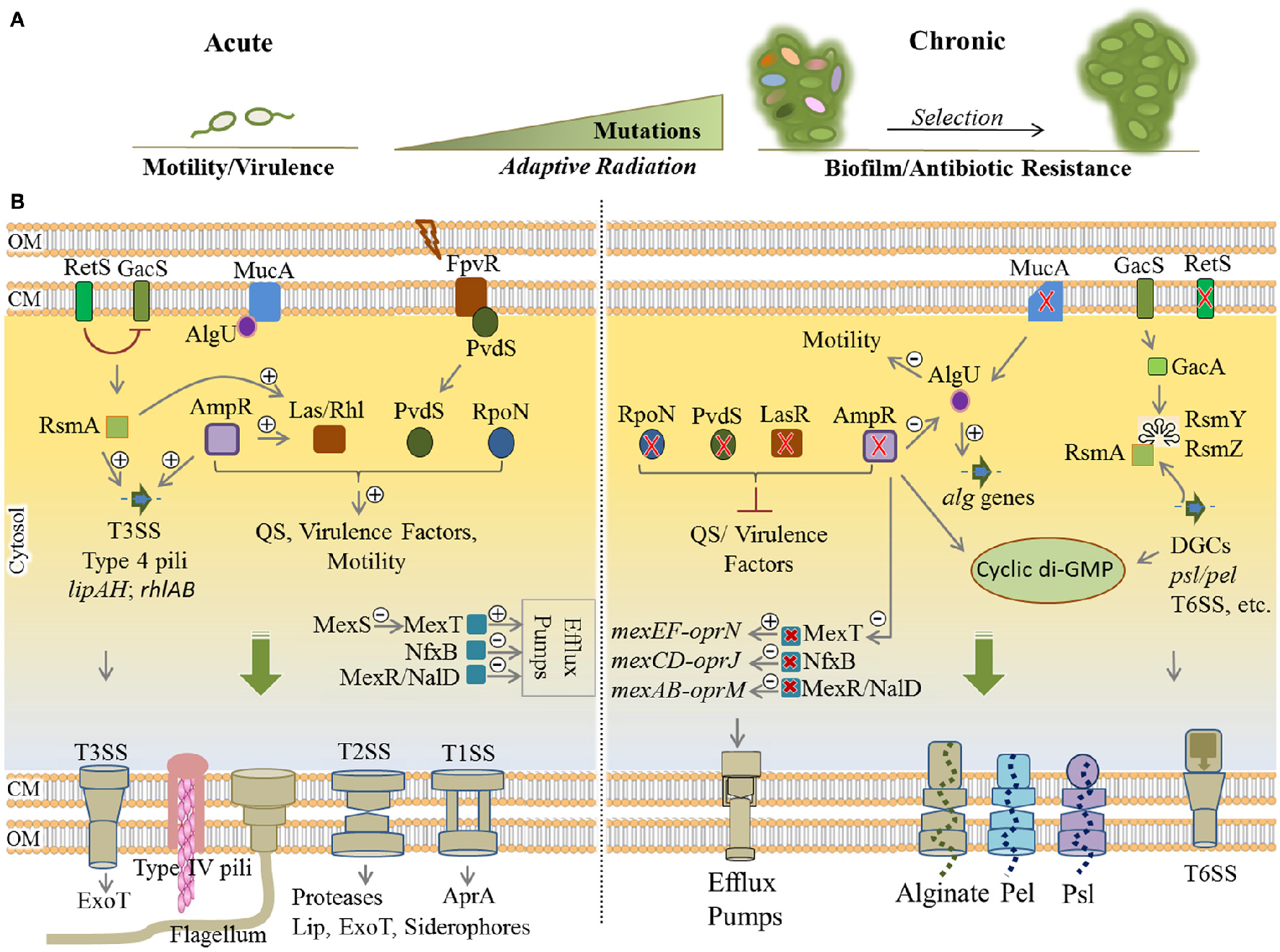 In the present review, we have attempted to summarize the diversity of these mechanisms causing the versatility of P. aeruginosa to adapt and thrive in unfavorable conditions particularly during pathogenesis. To this end, we will describe the clinical importance of P. aeruginosa followed by the well-characterized and most recent findings about key strategic adaptation mechanisms including quorum sensing (QS), motility-sessility switch, biofilm formation, antibiotic resistance mechanisms, adaptive radiation for persistence, stringent response and persisters, and the CRISPR-Cas systems. Recent findings on adaptive mechanisms will be set into context of the overall physiology of P. aeruginosa by also depicting on future research needs.