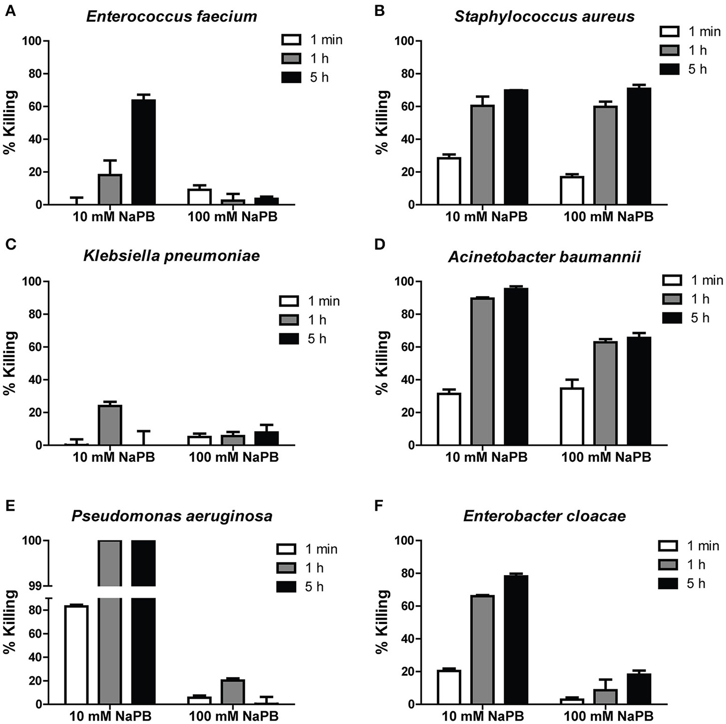 Killing of ESKAPE cells by Hst 5. E. faecium(A), S. aureus(B), K. pneumoniae(C), A. baumannii(D), P. aeruginosa(E), and E. cloacae(F) cells in exponential growth were exposed to 30 μM Hst 5 in 10 mM NaPB or 100 mM NaPB for 1 min, 1, and 5 h. Aliquots taken at different time points were diluted and plated. CFU were determined after 24 h. Error bars represent the standard errors from at least three independent replicates of each strain.