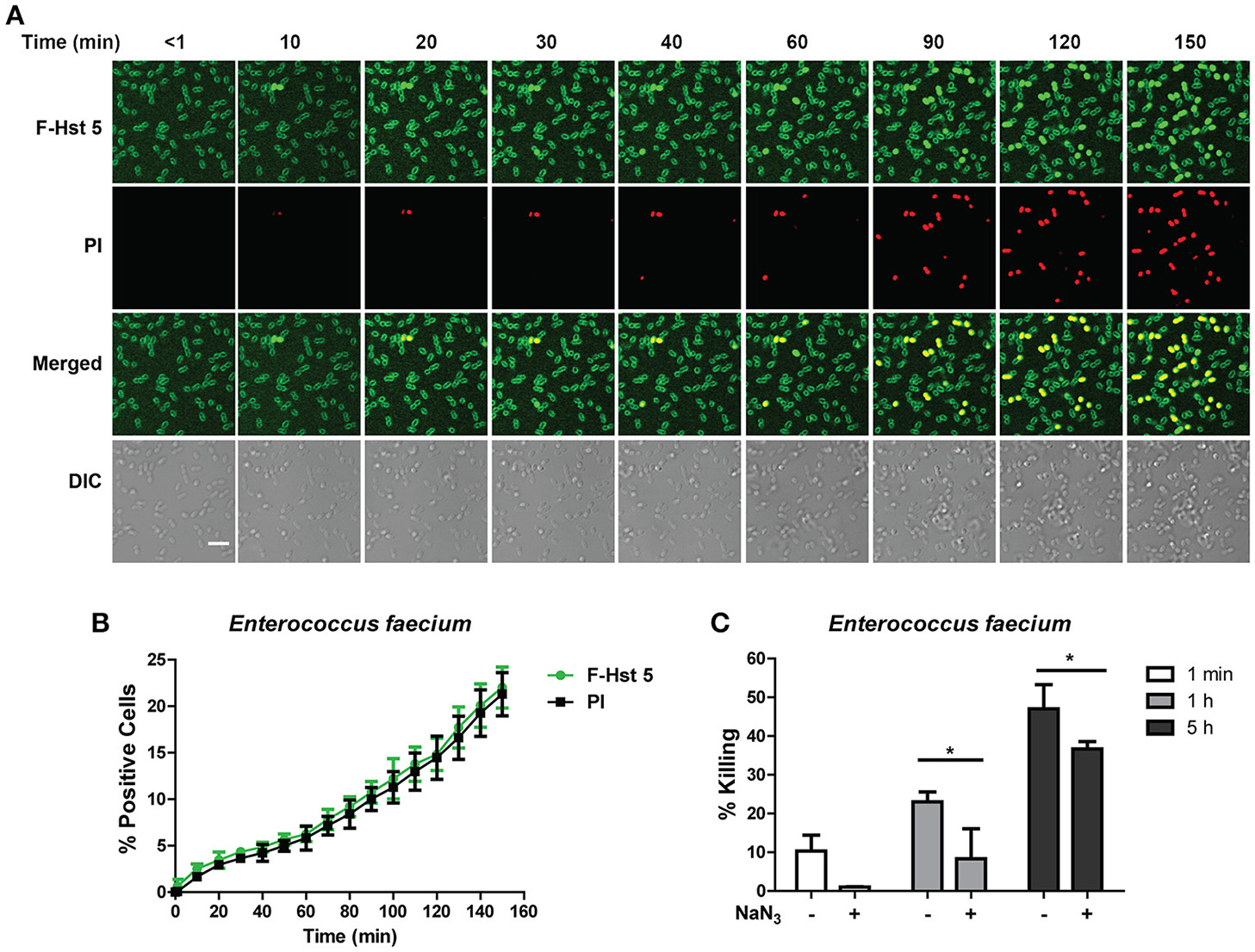 Time-lapse confocal microscopy showed that Hst 5 (30 μM) rapidly (< 1 min) bound with the surface of E. faecium cells, although no internalization was evident until after 10 min of incubation (Figure 2A). This slow internalization resulted in only 15% of cells taking up F-Hst 5 by 120 min; but in each instance, Hst 5 internalization was accompanied by PI uptake (indicative of cell death; Figure 2B). This close correlation between intracellular Hst 5 and PI uptake suggested that targets of Hst 5 are intracellular rather than its effects being membrane lytic. However, the percentage of killing from the bactericidal assay was higher than apparent PI staining, suggesting that some portion of killing was delayed. To evaluate this, we pretreated cells with an inhibitor of energy metabolism (NaN3) as a means to determine whether the killing activity of Hst 5-treated E. faecium might be dependent upon cell metabolism. As expected, pretreatment of cells with NaN3 significantly reduced the killing efficiency of Hst 5 at 1 and 5 h (Figure 2C), showing that some portion of Hst 5 killing of E. faecium requires target cell energy, likely for Hst 5 internalization or intracellular organelle localization.