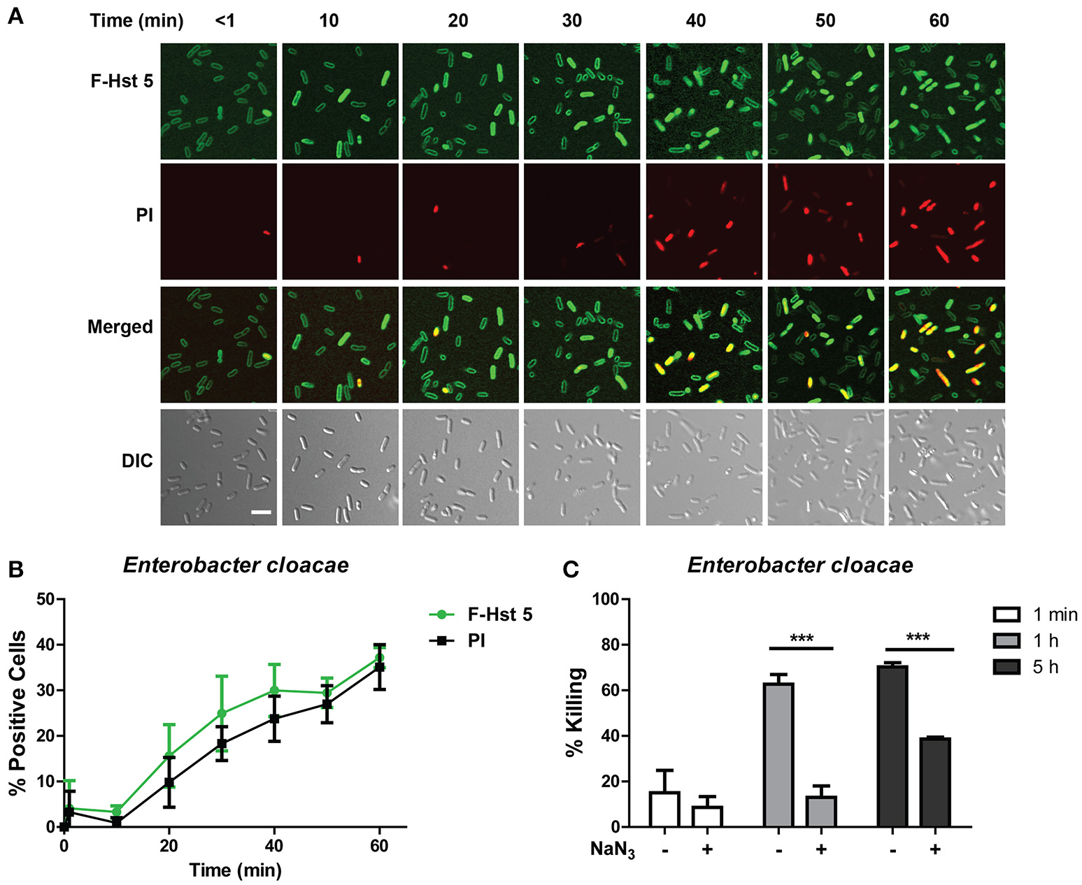 In agreement with its high bactericidal activity, F-Hst 5 completely covered the cell surface of P. aeruginosa within 1 min, and PI positive cells could be visualized within 2 min (Figure 4A). Quantitative analysis showed that 75% of cells contained F-Hst 5 and were PI positive within 5 min of addition of F-Hst 5 (Figure 4B). Both intracellular localization of Hst 5 and PI staining were rapid and simultaneous, pointing toward membrane lytic activity of Hst 5 mediated killing of P. aeruginosa. Pretreatment of P. aeruginosa cells with 10 mM NaN3 did not reduce the killing activity of Hst 5 (Figure 4C), also suggesting energy-independent membrane disruption as the main pathway for Hst 5 killing activity against P. aeruginosa.