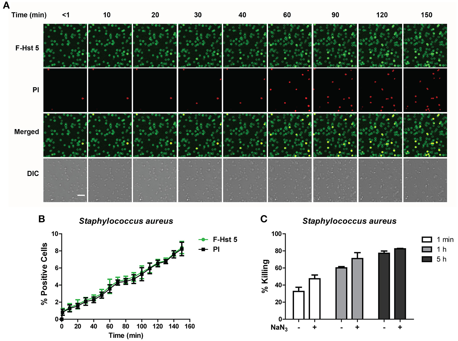 F-Hst 5 was visualized binding to the cell surface of all S. aureus cells within 1 min after addition, however intracellular localization and PI uptake occurred slowly (Figure 6A), so that by 120 min only 7% of cells contained F-Hst 5 and were PI positive (Figure 6B). This was surprising since bactericidal activity of Hst 5 after 1 h incubation was found to have 60% killing (Figure 1). Furthermore, bactericidal assay with S. aureus pretreated with 10 mM NaN3 did not decrease the killing efficiency (Figure 6C). These results, combined with the salt-insensitive killing, suggest that there may be multiple targets for Hst 5-mediated killing of S. aureus that are non-lytic and energy independent.