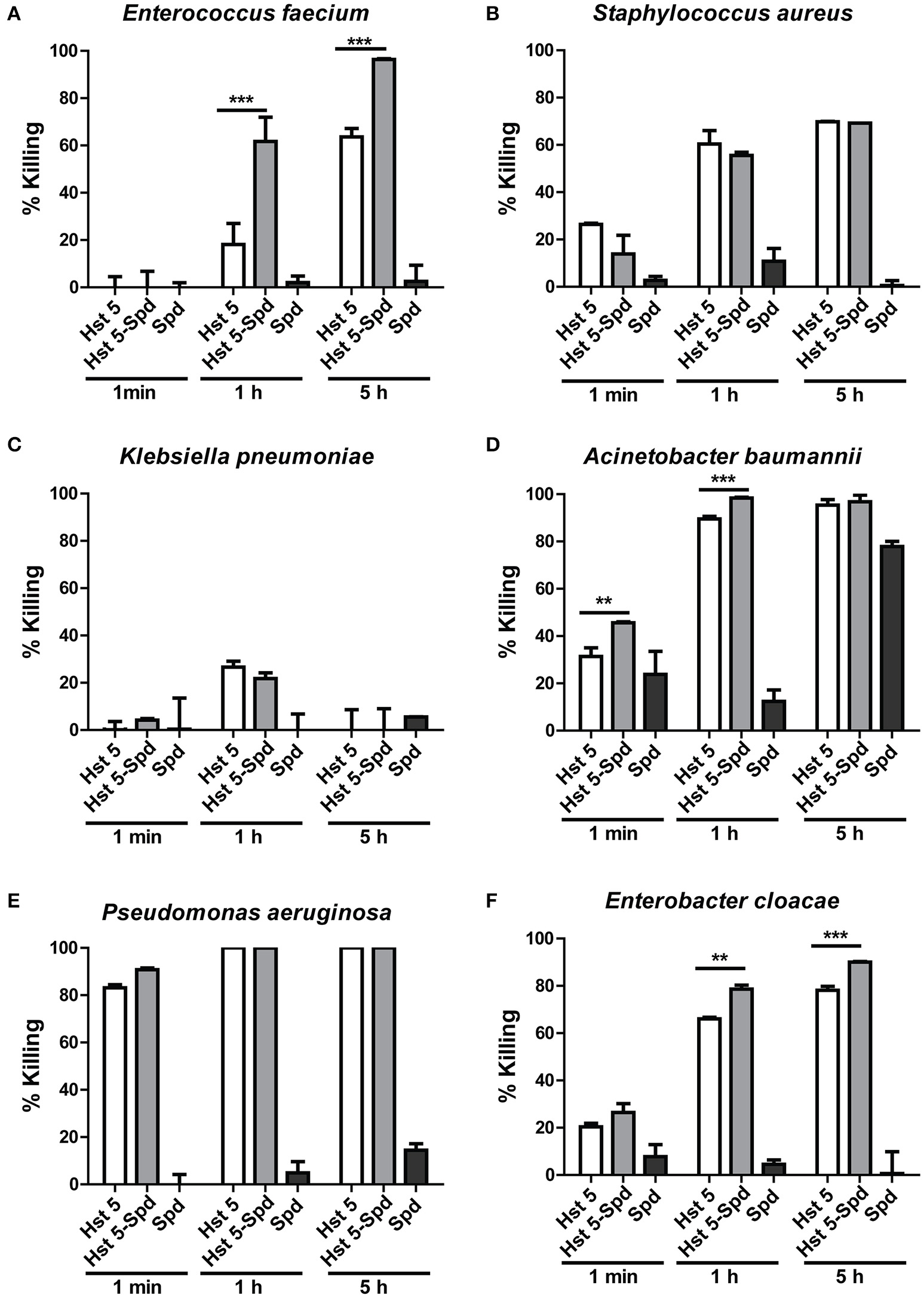 Killing of ESKAPE pathogens by Hst 5-Spd. E. faecium(A), S. aureus(B), K. pneumoniae(C), A. baumannii(D), P. aeruginosa(E), and E. cloacae(F) cells in exponential growth were exposed to 30 μM of Hst 5, F-Hst 5 and spermidine in 10 mM NaPB for 1 min, 1, and 5 h. Aliquots taken at different time points were diluted and plated. CFU were determined after 24 h. Error bars represent the standard errors from at least three independent replicates of each strain. Hst 5-Spd conjugate showed more killing efficiency against E. faecium(A), A. baumannii(D), and E. cloacae(F) (**P < 0.01, ***P < 0.001, Student's t-test).