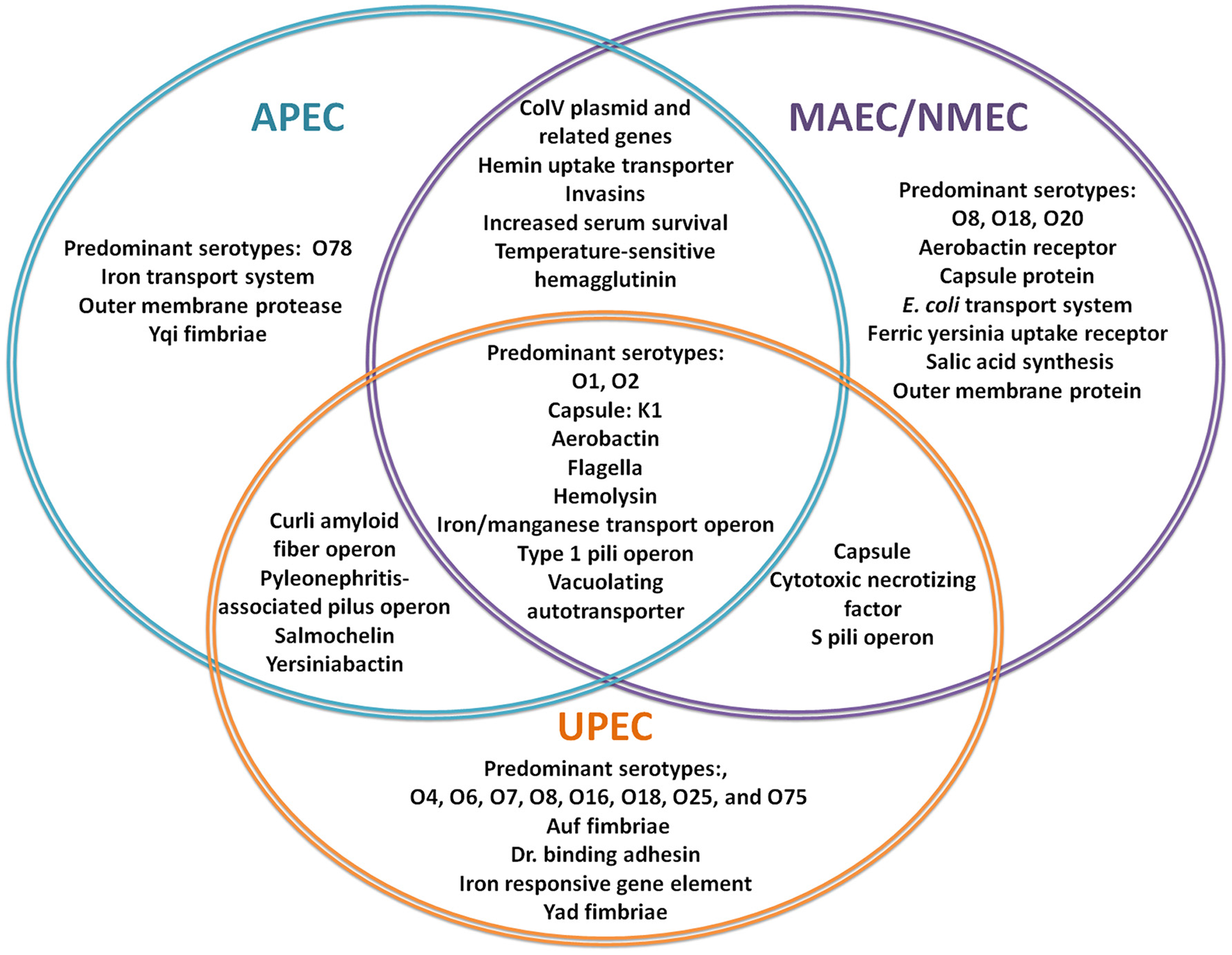 Virulence factors involved in ExPEC infections. The Venn Diagram represents the most commonly reported, shared and individual, virulence factors for APEC (blue), MAEC/NMEC (purple), and UPEC (orange). (Knöbl et al., 2001; Johnson et al., 2006; Lloyd et al., 2007; Wiles et al., 2008; Zhu et al., 2010; Nazemi et al., 2011; Spurbeck et al., 2011; Logue et al., 2012; Zhu Ge et al., 2014; Huja et al., 2015; Wang et al., 2015; Wijetunge et al., 2015).