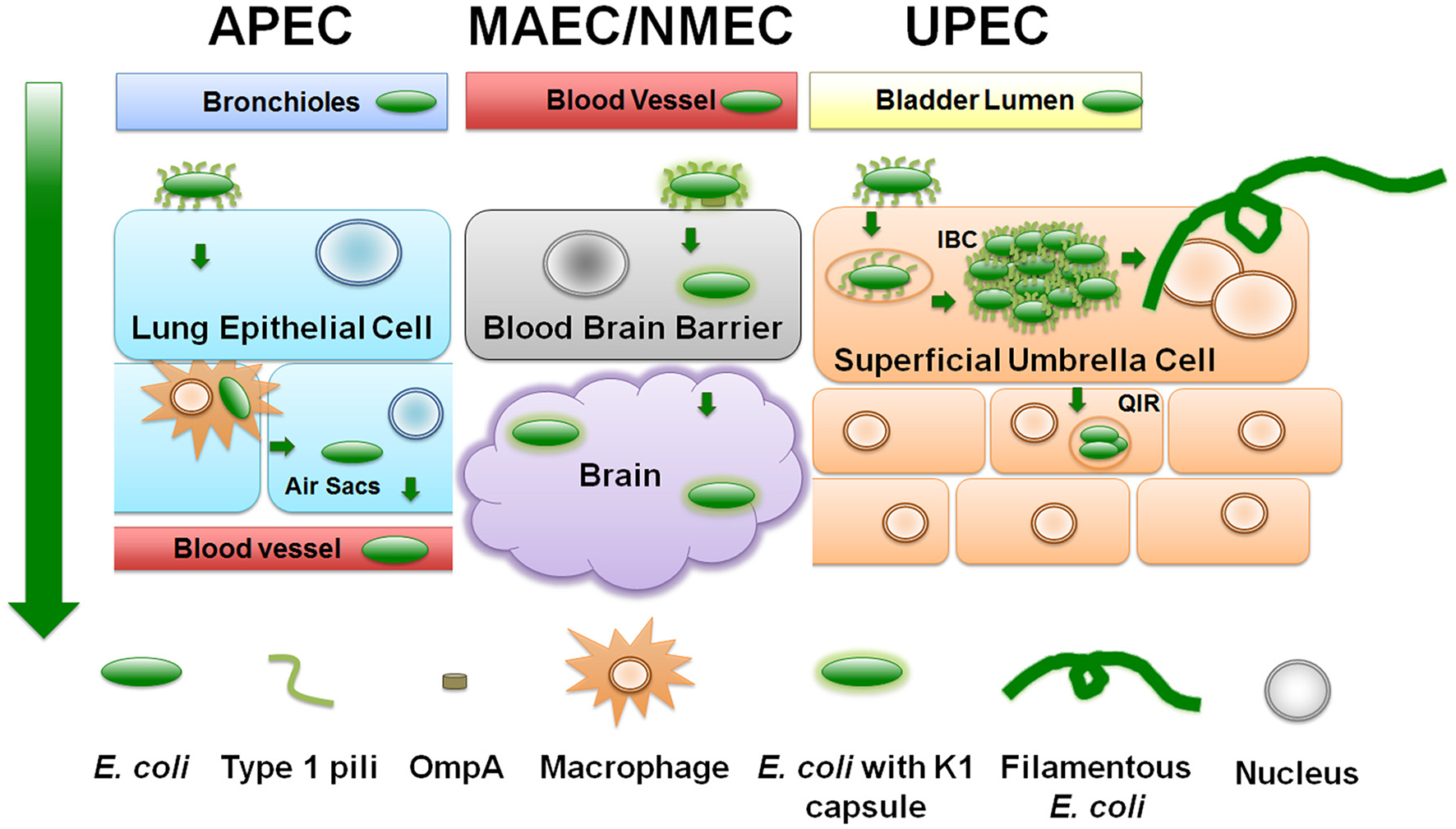 ExPEC infection strategies. Diagram depicts a generalized schematic of the known and relevant aspects of ExPEC infections. The leftmost green arrow depicts the typical route of infection from point of entry. APEC attach to upper respiratory epithelial cells using type 1 pili. APEC can replicate and transverse the respiratory tract to the bloodstream by means of avian macrophages. NMEC/MAEC exit the bloodstream and attach via type 1 pili to brain micro-vascular endothelial cells that comprise the blood brain barrier. NMEC enter the endothelial cells through OmpA receptor-mediated entry. From here, NMEC are able to colonize the brain and meninges. UPEC attach to urothelial cells in a type 1 pili-dependent manner. UPEC are then endocytosed and escape into the cytosol where they replicate into intracellular bacterial communities (IBC). UPEC escape the IBC state by filamenting and fluxing out of the infected host cell. Dispersing UPEC can infect neighboring or underlying transitional cells, and/or can ascend the ureters to colonize and infect the kidneys.