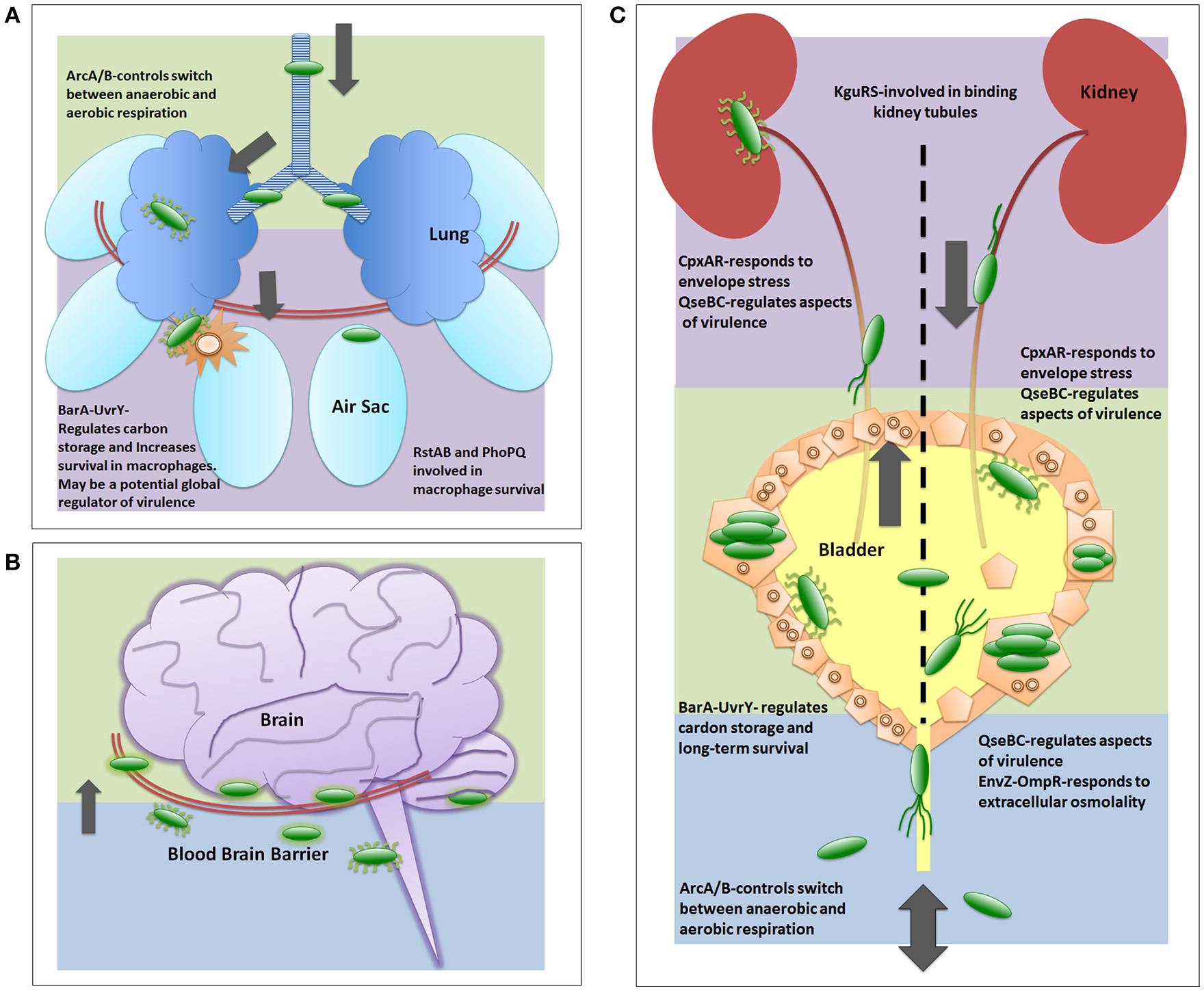 Two-component systems involved in UPEC pathogenesis. The two-component systems are listed in the general order in which they are reported as critical for each infection strategy. (A) depicts a generalized view of APEC pathogenesis infecting an avian respiratory tract. Early infection is denoted by green color. Late infection is outlined by purple color. (B) depicts a generalized view of MAEC/NMEC infection in a human brain by crossing the blood brain barrier. Following bacteria entering the blood stream, early meningitis infection is denoted by blue background where E. coli cells bind and traverse the blood brain barrier. Late infection is outlined by green background, which includes infection of the meninges. There are no publications on TCS involved in MAEC/NMEC pathogenesis; however, capsule, pili, and other virulence factors are required for pathogenesis and these are known to be regulated in part by TCS. (C) depicts a generalized view of UPEC infecting a human urinary tract. Blue background indicates entry and initiation of UPEC infection. Green depicts infection in the bladder. Purple depicts the ascension into and infection of the kidney.