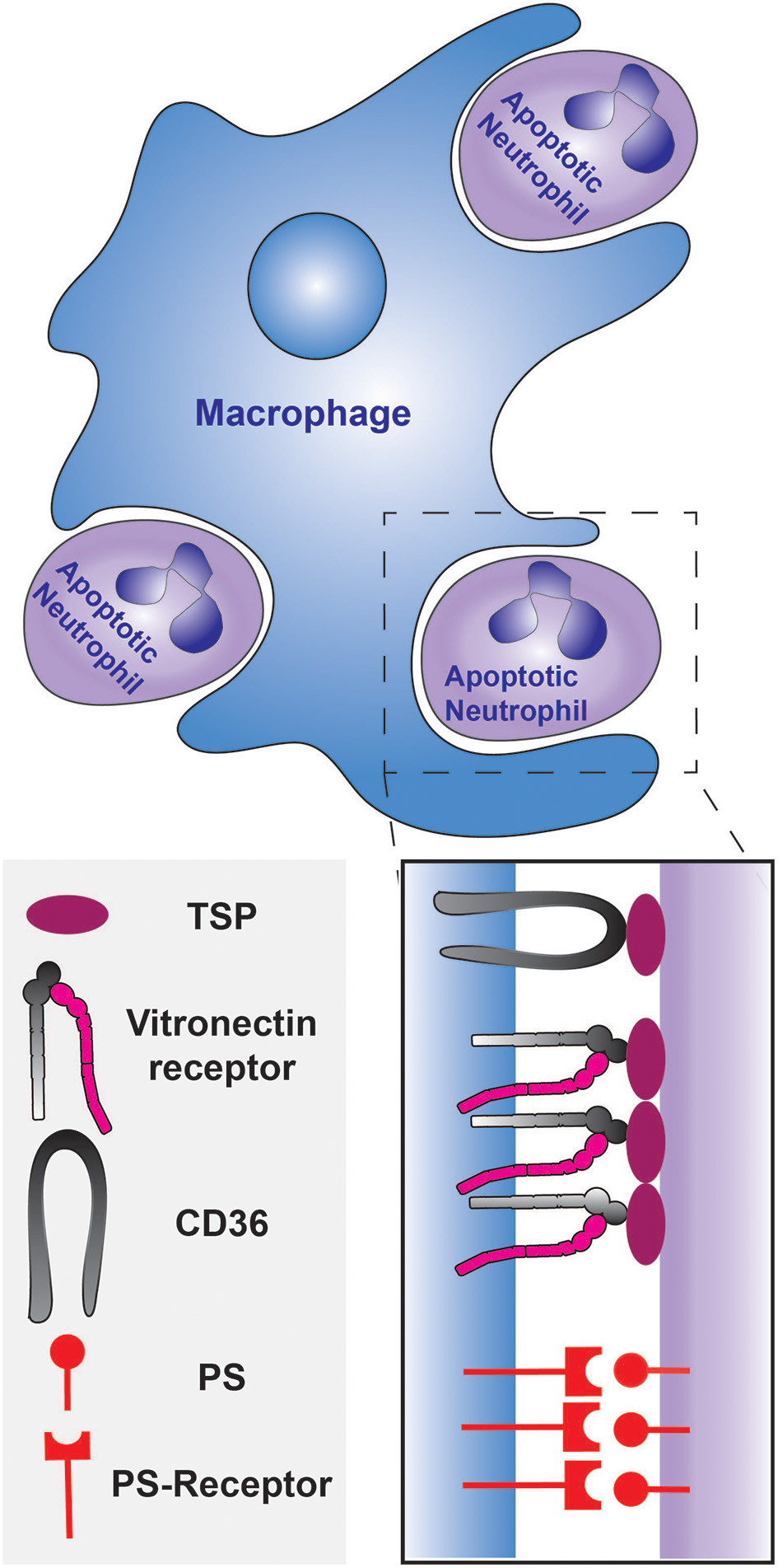 Figure 1. Phagocytosis of apoptotic neutrophils by a macrophage during the resolution of inflammation. The engulfment can be mediated by PS and/or the opsonization of the apoptotic neutrophils by thrombospondin. The thrombospondin-coated apoptotic cells are tethered to the macrophage by CD36, and the vitronectin receptor signals the initiation of phagocytosis. PS is recognized by the PS-receptor on the macrophage.