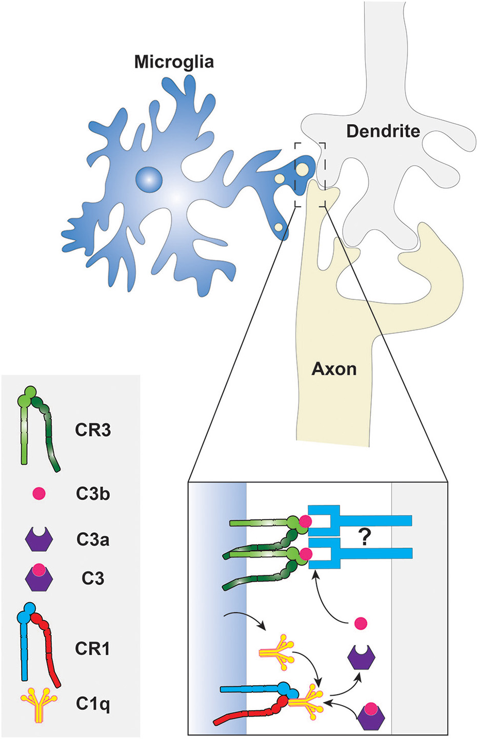 Figure 2. Phagocytosis of synaptic components by microglia. The classical complement cascade is initiated by the accumulation of C1q, produced by the microglia, at degenerating synapses. The C1q molecules bind CR1 on the microglial surface to form the C1 complex resulting in the eventual cleavage of C3. The fragments of C3 then opsonize the synaptic surface for subsequent phagocytosis via CR3. What targets C3 fragments to the synaptic membrane is unknown, thus it is depicted here as an unidentified molecule that may be a protein or a phospholipid. Other components of the C1 complex and complement cascade are not shown because they have not been studied in the context of synaptic pruning.