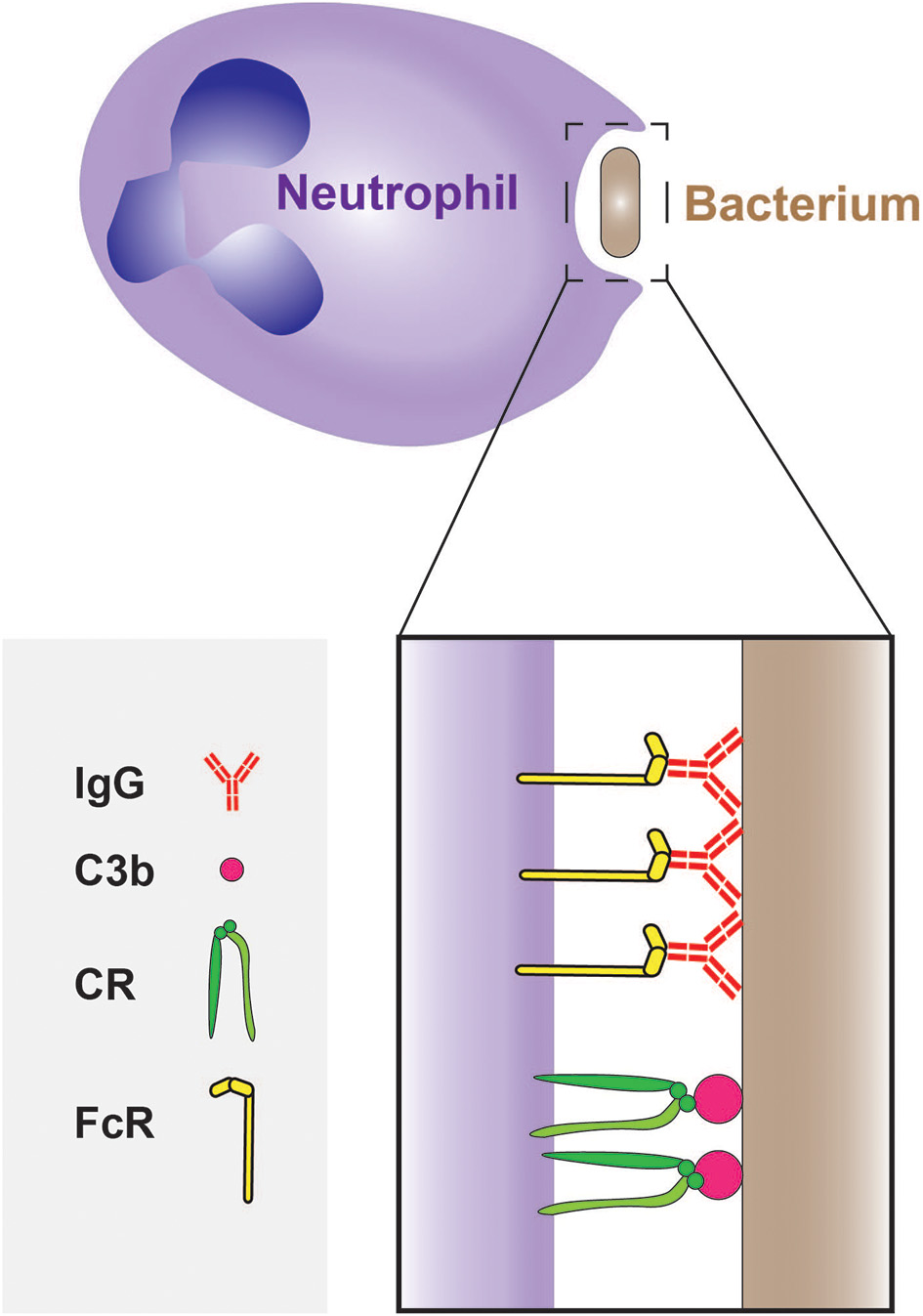 Figure 3. Phagocytosis of bacteria by neutrophils. The phagocytosis of bacteria is often mediated by opsonisation of their surface with IgG and C3b molecules, which are recognized by Fcγ receptors (FcγRs) and complement receptors (CRs), respectively.