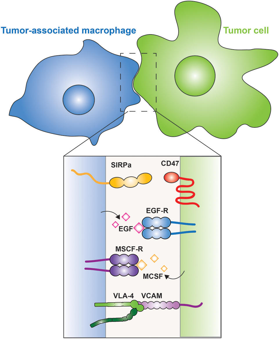 Figure 4. Tumor-associated macrophages. The interaction between a macrophage (blue) and a tumor cell (green) is illustrated. The inset shows the membrane proteins involved in tumor cell evasion and promotion. CD47 is a “don't eat me” signal expressed on the tumor cell, which is recognized by SIRPα on the macrophage. Tumor cells secrete M-CSF, which is recognized by the M-CSF receptor on the surface of macrophages, leading to the secretion of EGF by the latter; a positive feedback loop between the two cells is thus generated. Metastatic cells express VCAM that interacts with the integrin VLA-4, which activates cell survival pathways in the metastatic cell.