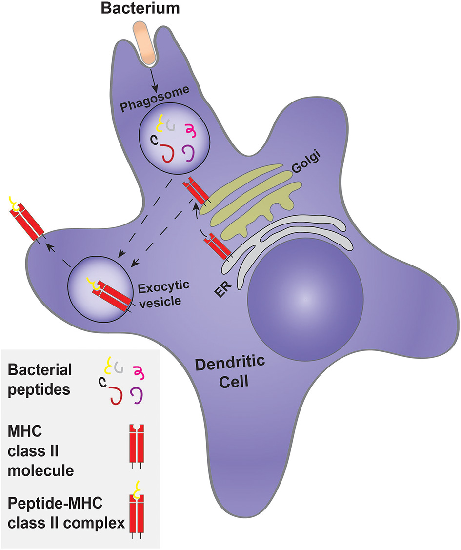 Figure 5. Classical antigen presentation by a dendritic cell. Dendritic cells engulf a target, such as bacteria, forming a phagosome. Controlled bacterial degradation in the phagosome generates peptides that are used for antigen presentation on MHC class II molecules. The MHC class II molecule is synthesized and processed by the ER and Golgi complex, being delivered to an exocytosis-competent vesicle where it encounters and is loaded with antigenic peptides to form the peptide-MHC class II complex.