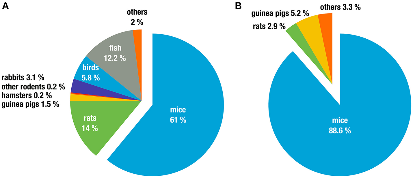 Animal classes used in experiments for (A) all life sciences disciplines in the 27 EU member states (2011 in %). Data taken from (The Commission to the Council and the European Parliament, 2013), and (B) research on infection biology only, in Germany (2011 in %). Data taken from (German Federal Ministry of Food and Agriculture, 2011).