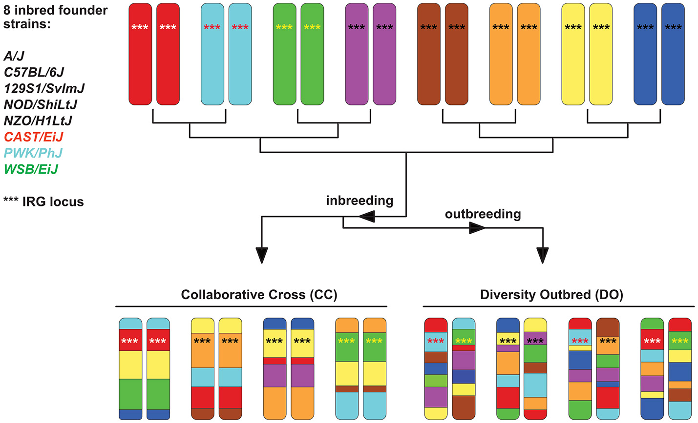 The concept for producing RIS sets has been extended by the Complex Traits Consortium to produce more genetically variable sets (Chia et al., 2005). These are known as Collaborative Crosses (CC) and are based on a set of 8 defined and sequenced founder strains, including three wild-derived strains of Mus and five traditional inbred strains. Although the set of strains is genetically diverse, each CC strain is at least 90% homogenous and hence genetically well-defined. The CCs were designed specifically for complex trait analysis (Churchill et al., 2004; Threadgill and Churchill, 2012) and the derived Diversity Outbred (DO) population (Churchill et al., 2012) has resulted in an even more genetically diverse mouse population (see Figure 3). Other derivatives of CC's concept exist, like the Heterogeneous Stock mice (Valdar et al., 2006) or the Hybrid Mouse Diversity Panel (Bennett et al., 2010). Besides GWAS studies, which map determinants for non-infectious diseases, CC animals have recently been used to map susceptibility or pathogenesis determinants in bacterial and viral infection models (Durrant et al., 2011; Ferris et al., 2013; Rasmussen et al., 2014; Vered et al., 2014; Gralinski et al., 2015; Lore et al., 2015; Smith et al., 2016). However, no data for parasite infections have been reported so far, and their large potential for exploring how host genotype influences infections needs to be explored in the future. Nevertheless, CC and DO mice also have limitations (Phifer-Rixey and Nachman, 2015). They are all derived from subspecies, which limits the genetic variation and may cause partial hybrid sterility in crosses. This, in turn, might have resulted in the elimination of genetic variation at these genomic loci. However, it is expected that further crosses will improve these models on the genetic level.