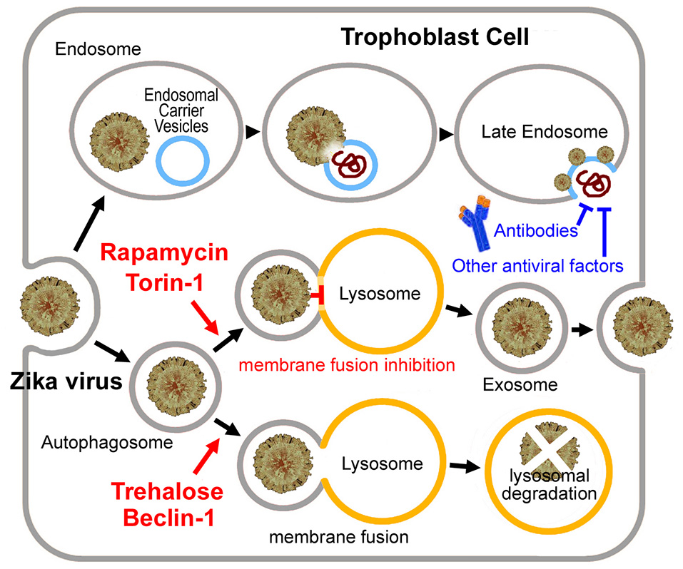 Putative Zika virus entry pathway and the exosome pathway in the trophoblast cell. For Zika virus, upon binding to the receptor, the virus enters the early endosome through the endocytic process. Several minutes later, the virus particle fuses with the endosomal carrier vesicle (ECV) membrane predominantly. However, for a short time, viral nucleocapsids remain trapped in the ECV lumen, until ECV fuses back with the late endosome membrane. Then the nucleocapsid is released. Alternatively, the virus may enter the autophagosome, and then to be degradated by fusing with the lysosome or become a sort of cargo of the placental exosome by blocking the autophagosome-lysosome fusion. Exosome may provide the virus with a shield from the mother's immune system. Neutralizing antibodies or other antiviral factors cannot work on the virus embedded in the exosome. Torin 1 or rapamycin induces exosome aggregation with the virus embedded in, if the lysosomal fusion step was blocked. While Beclin 1 or trehalose rescues the impaired fusion step, which results in lysosomal degradation of the virus.