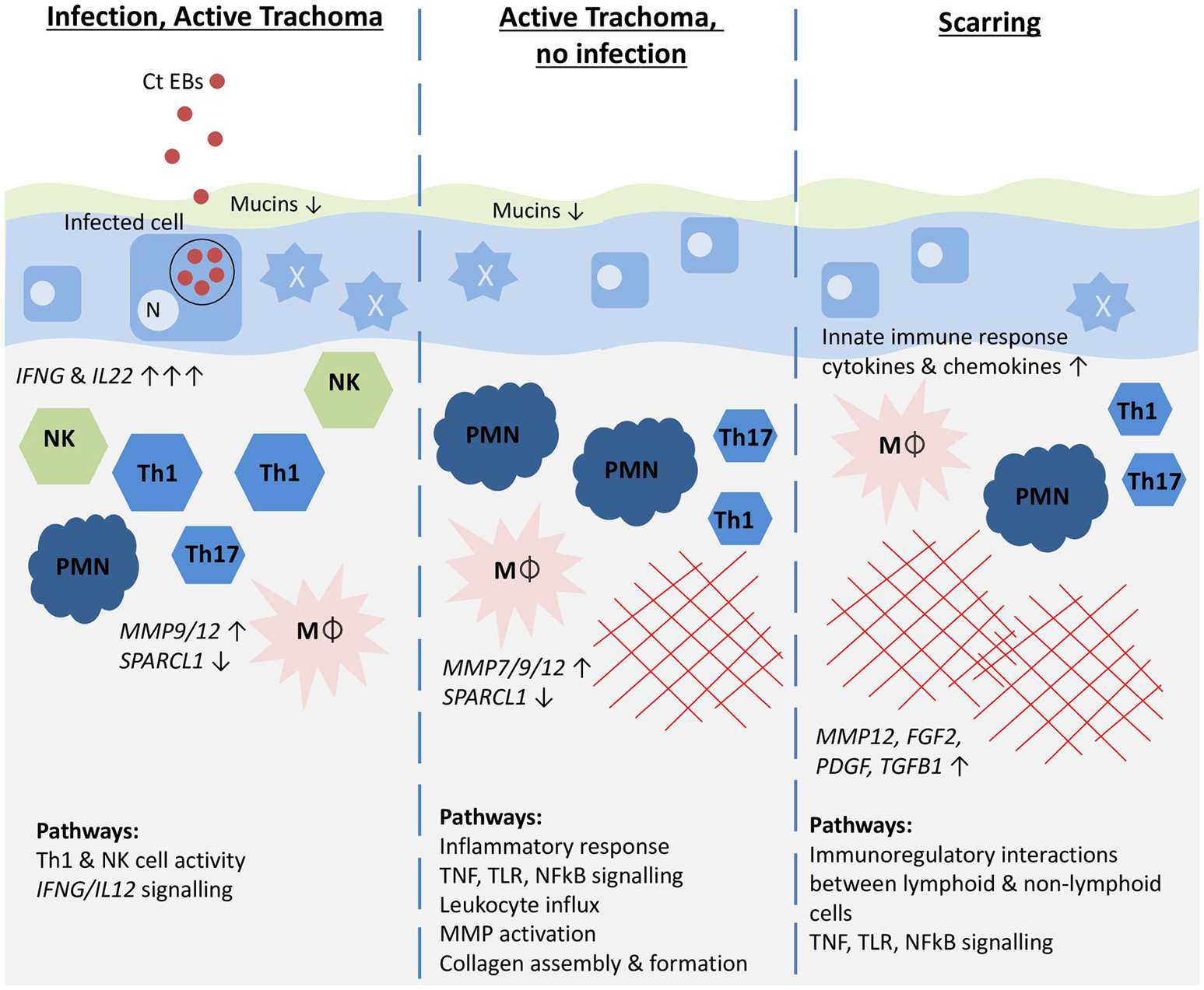 Previously, we and others have explored the immunological correlates of the different stages of trachoma mostly through cross-sectional studies using a range of methodologies, including gene expression and protein analysis, immunohistochemistry and genome wide association studies (Bobo et al., 1996; Burton et al., 2004, 2011b, 2015; Skwor et al., 2008; Holland et al., 2010; Natividad et al., 2010; Derrick et al., 2013, 2016a,b; Hu et al., 2013a, 2016; Roberts et al., 2015). These studies have shown an increase in pro-inflammatory and matrix factors (IL1B (interleukin 1 beta), TNF (tumor necrosis factor), S100A7 (psoriasin), IL17A, IFNG (interferon gamma), perforin, IL12, IL10, CXCL5, CTGF (connective tissue growth factor) and MMP9 (matrix metalloproteinase 9) in individuals with active trachoma and/or chlamydial infection, indicating the involvement of a type 1 T helper (Th1) cell response, NK cell cytotoxicity and potentially Th17 cells. In individuals with trachomatous scarring and/or trichiasis, factors involved in innate pro-inflammatory responses and matrix remodeling (IL1B, CXCL5, S100A7, CTGF, MMP7, and MMP9) were upregulated.