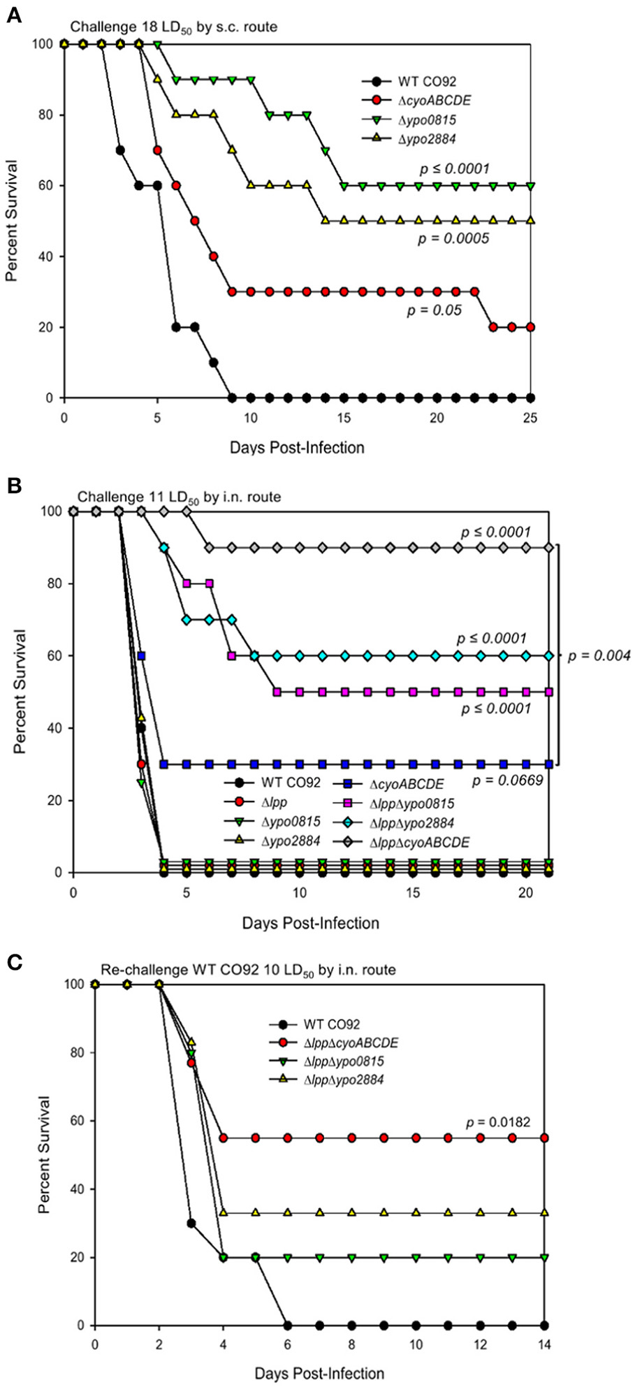 In-frame deletion mutants ypo0815, ypo2884, and cyoABCDE of Y. pestis CO92 exhibited varying levels of attenuation in mice, which was further augmented when these genes were deleted from the Δlpp background strain of CO92