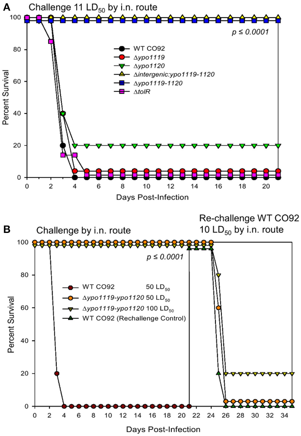 Contribution of Tol operon-associated genes in the virulence of Y. pestis CO92 in a mouse model of pneumonic plague. (A) Female Swiss-Webster mice were challenged by the i.n. route with 11 LD50 of WT Y. pestis CO92 or the indicated deletion mutant strains (n = 10). Animals were observed for morbidity/mortality for 21 days p.i. (B) Mice were challenged by the i.n. route with the WT CO92 or the Δypo1119-1120 deletion mutant (n = 10) at the indicated LD50 doses and then observed for morbidity/mortality over a period of 21 days. Mice that survived the initial infection with the mutant strain (n = 10) and naive control animals (n = 5) were challenged with 10 LD50 of the WT CO92 strain and monitored for 14 days p.i. Survival data were analyzed for significance by Kaplan–Meier survival estimates. Two independent experiments were performed and the data from the second set constituting a group size of 10 animals/group were presented.