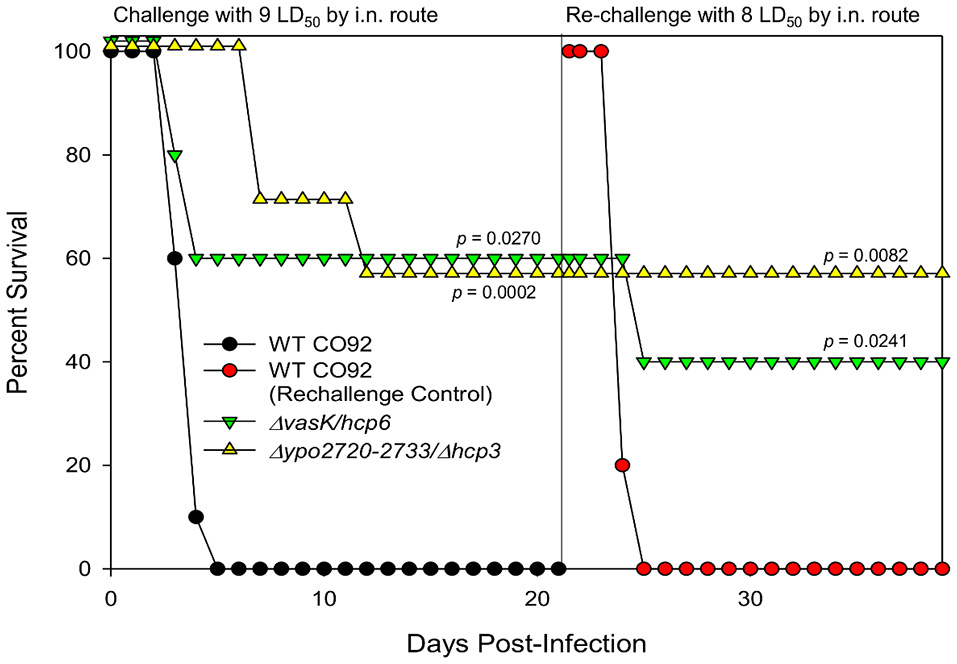 As one of our long-term goals is to develop live-attenuated vaccine candidates, animals that survived initial infection with ΔvasKΔhcp6 and Δypo2720-2733Δhcp3 mutants were re-challenged with WT CO92 by the i.n. route to mimic pneumonic infection. As shown in Figure 4, 100% of the animals initially infected with Δypo2720-2733Δhcp3 and re-challenged with WT CO92 at 8 LD50 survived and were observed to be protected over a tested period of 18 days. For the ΔvasKΔhcp6 mutant, one animal did succumb to infection; however, still exhibited significant, 40%, survivability in comparison to control WT CO92 challenged mice, which all succumbed to infection by day 4 (Figure 4). Therefore, these mutants can serve as background strains for the deletion of additional genes to further attenuate the bacterium while maintaining immunogenicity.