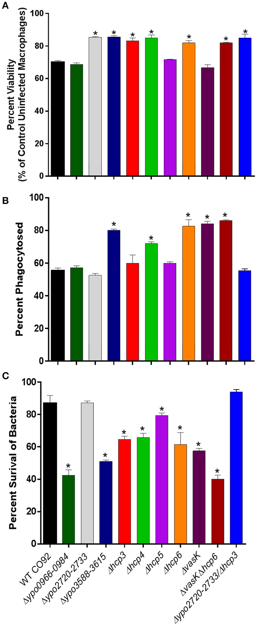 The T6SS delivers effector molecules into target cells using a needle like apparatus with high homology to the assembly, structure, and function of bacteriophage tails (Records, 2011). It has been reported that T6SS can target both bacterial and eukaryotic cells and cause cytotoxicity (Russell et al., 2014). To evaluate any changes in cytotoxic effects of the attenuated T6SS deletion mutant strains on eukaryotic cells, we used the MTT assay to measure cell viability following infection. RAW 264.7 murine macrophages were infected with the various Y. pestis strains (WT CO92 or the Δypo0966-0984, Δypo2720-2733, or Δypo3588-3615 clusters, Δhcp3, Δhcp4, Δhcp5, Δhcp6, ΔvasK single, or ΔvasKΔhcp6 and Δypo2720-2733Δhcp3 double deletion mutants) at a MOI of 100, and incubated for 12 h. Macrophages infected with two cluster deletion mutants (Δypo2720-2733 and Δypo3588-3615), three hcp homolog deletion mutants (Δhcp3, Δhcp4, and Δhcp6), and both combinatorial deletion mutants (ΔvasKΔhcp6 and Δypo2720-2733Δhcp3) exhibited significantly higher cell viabilities in comparison to WT CO92 (Figure 6A). These results indicated that the above-mentioned mutant strains were significantly less cytotoxic to host cells during infection in comparison to WT CO92.
