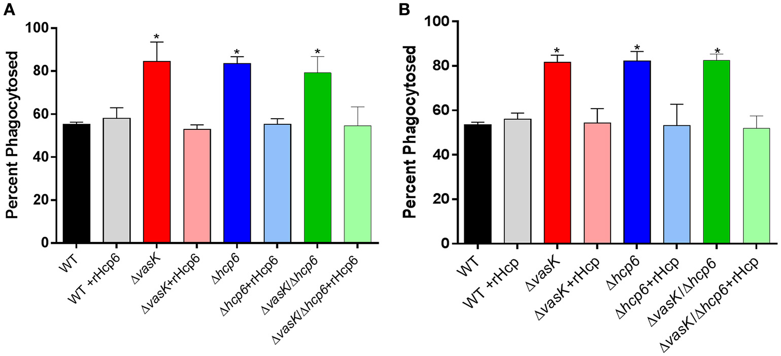 As we have previously reported that Hcp inhibits phagocytosis of A. dhakensis (Suarez et al., 2010), we further evaluated the phagocytic role of hcp6, which has high homology (82%) to hcp of A. dhakensis, in Y. pestis. RAW 264.7 murine macrophages were infected with WT CO92, ΔvasK, Δhcp6, or ΔvasKΔhcp6 mutant strains with or without the addition of recombinant(r)Hcp6 from CO92 (Figure 7A) or rHcp from A. dhakensis (Figure 7B), thus allowing for complementation of the mutants with exogenous Hcp6 protein. We noted that for all three mutant strains tested, the rate of phagocytosis was significantly increased in comparison to WT CO92 (Figures 7A,B). Furthermore, the ability of these mutants to be phagocytosed was significantly reduced, to levels equivalent to that of WT CO92, with the addition of rHcp6/rHcp at a physiologically relevant concentration of 10 μg/mL (Suarez et al., 2010; Figures 7A,B).