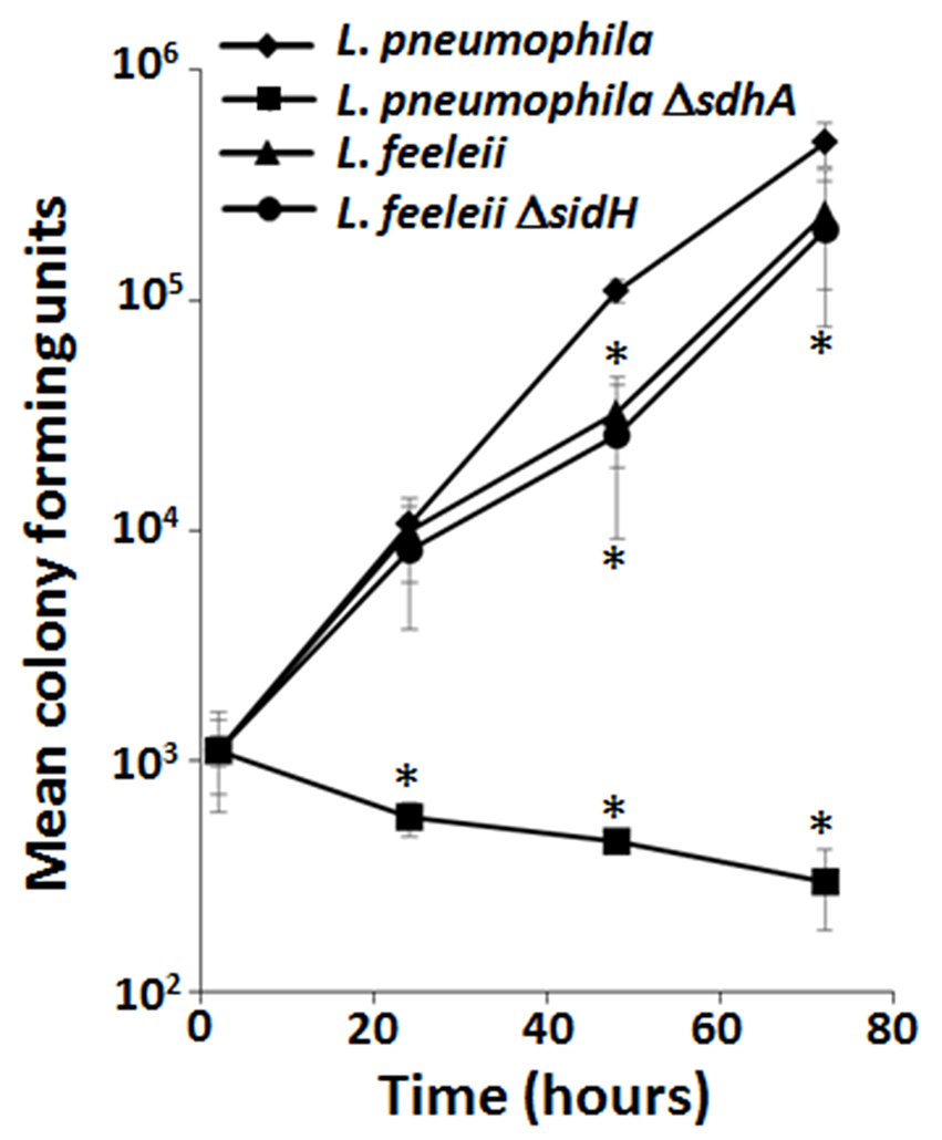 Lack of the SidH family of Dot/Icm translocated substrates does not impair growth of L. feeleii in macrophages despite being indispensable in L. pneumophila. Growth of wild type L. pneumophila, L. pneumophila ΔsdhA, wild type L. feeleii and L. feeleii ΔsidH in A/J mouse bone marrow-derived macrophages, based on recovered colony forming units (CFU) on solid media from lysed host cells, was monitored over 72 h encompassing 3 consecutive rounds of infection (Supplemental Material). Plotted is the total bacterial yield at the indicated time points normalized to the L. pneumophila wild-type strain by the number of intracellular bacteria 2 h post infection. Data are representative of at least 2 independent experiments ± standard deviation of 3 replicates. An asterisk indicates a P < 0.05 based on a Student's t-test relative to the L. pneumophila wild type strain.