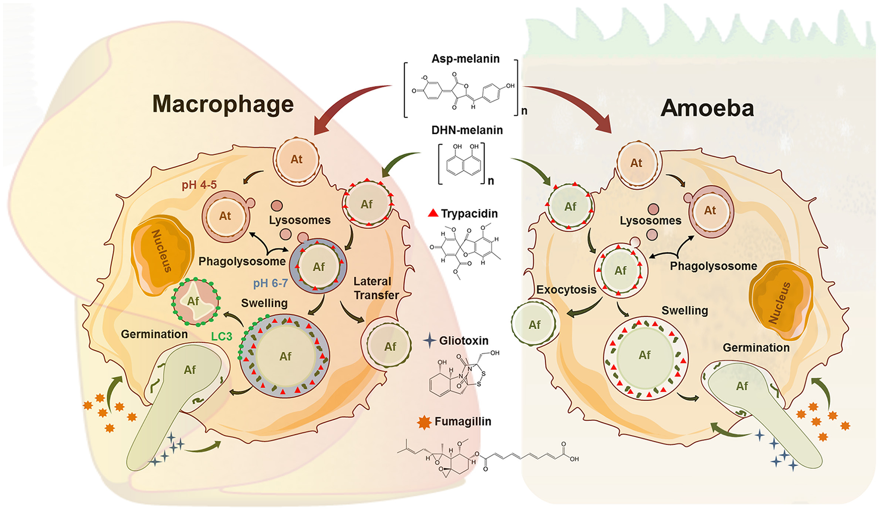 Comparative schematic view on parallel events in the phagocytic processing of fungal conidia from Aspergillus fumigatus (Af) and Aspergillus terreus (At) in macrophages and amoeba. The latter summarizes results from A. castellanii (Ac) and D. discoideum (Dd). The conidial pigments Asp-melanin (At) and DHN-melanin (Af) are complex polymers and the final-known intermediate structure is displayed. Ingested spores of At can persist in acidified phagolysosomes (PLs) in macrophages. Acidification of At containing PLs occurs also in D. discoideum. In macrophages, Af can either be killed via the LC3 dependent pathway, laterally transferred to other cells, or undergo swelling and germination. Exocytosis (Ac), swelling (Ac, Dd) and germination (Ac, Dd) of Af conidia has also been documented in amoeba, while killing by amoeba has not been reported. The spore-borne trypacidin, and the secreted gliotoxin and fumagillin are all made by A. fumigatus only and are all known to affect macrophages as well as Dd.