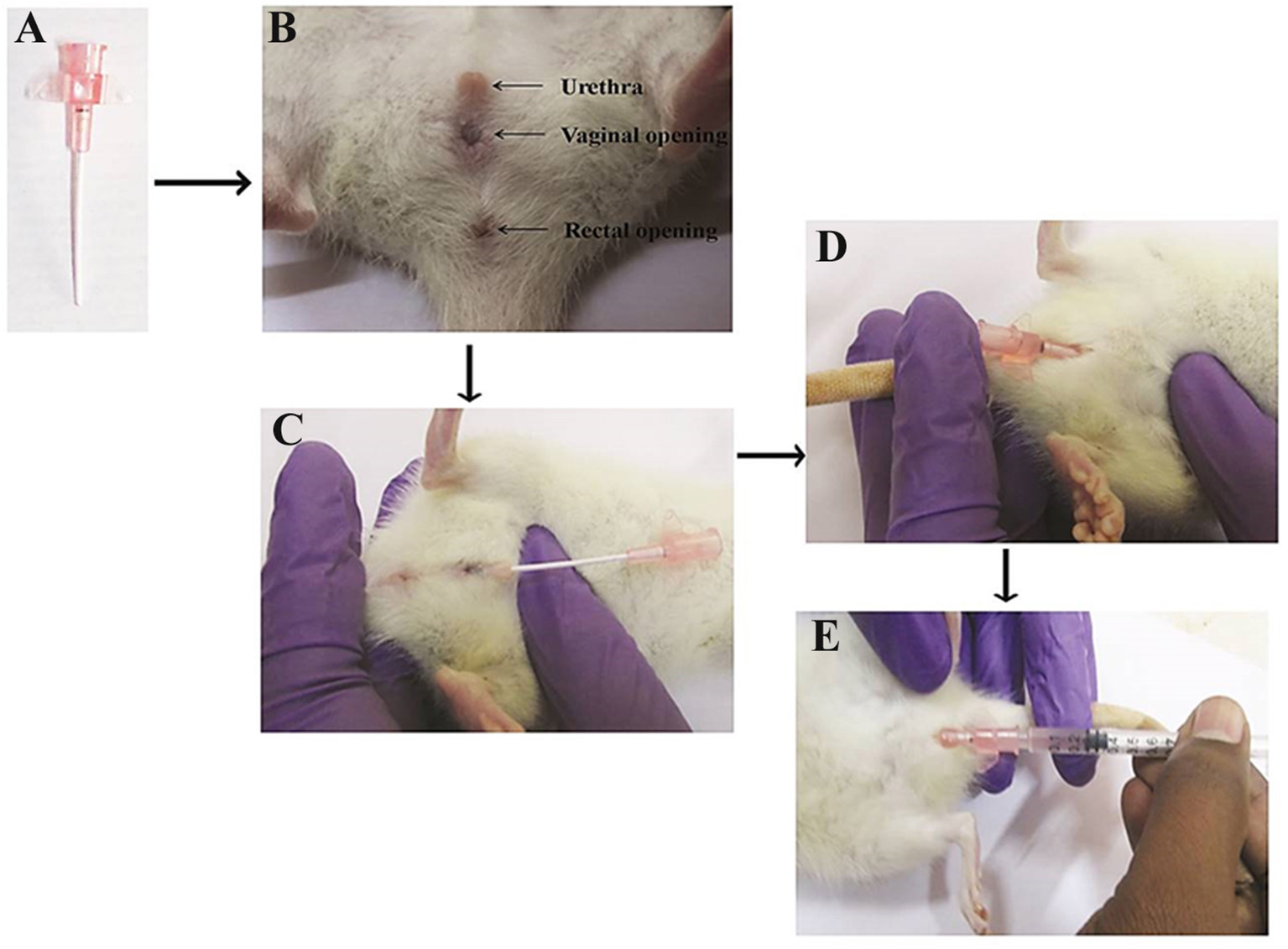 Urinary catheterization of angiocatheter into the bladder through the urethra. Twenty-gauge IV angiocatheter (A), three visible urethral, vaginal and rectal opening (B), insertion of angiocatheter into the urethral opening till it reaches the vaginal opening (C), rotation of angiocatheter upward to the rat (D), and injection of S. marcescens bacterial inoculum into the bladder (E).
