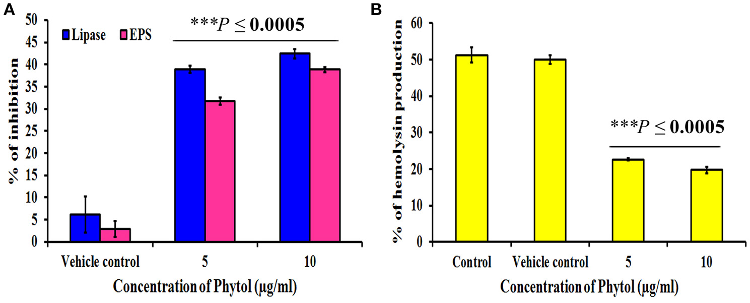 Effect of phytol on QS mediated virulence factors production in S. marcescens. Phytol treatment (5 and 10 μg/ml) significantly inhibited the lipase, EPS (A) and hemolysin (B) productions in S. marcescens. One percent of methanol was used as a vehicle control. Error bar indicates standard deviations from the mean. Student-t test was used to compare the control and treated samples. ***Indicates significant at p ≤ 0.0005.