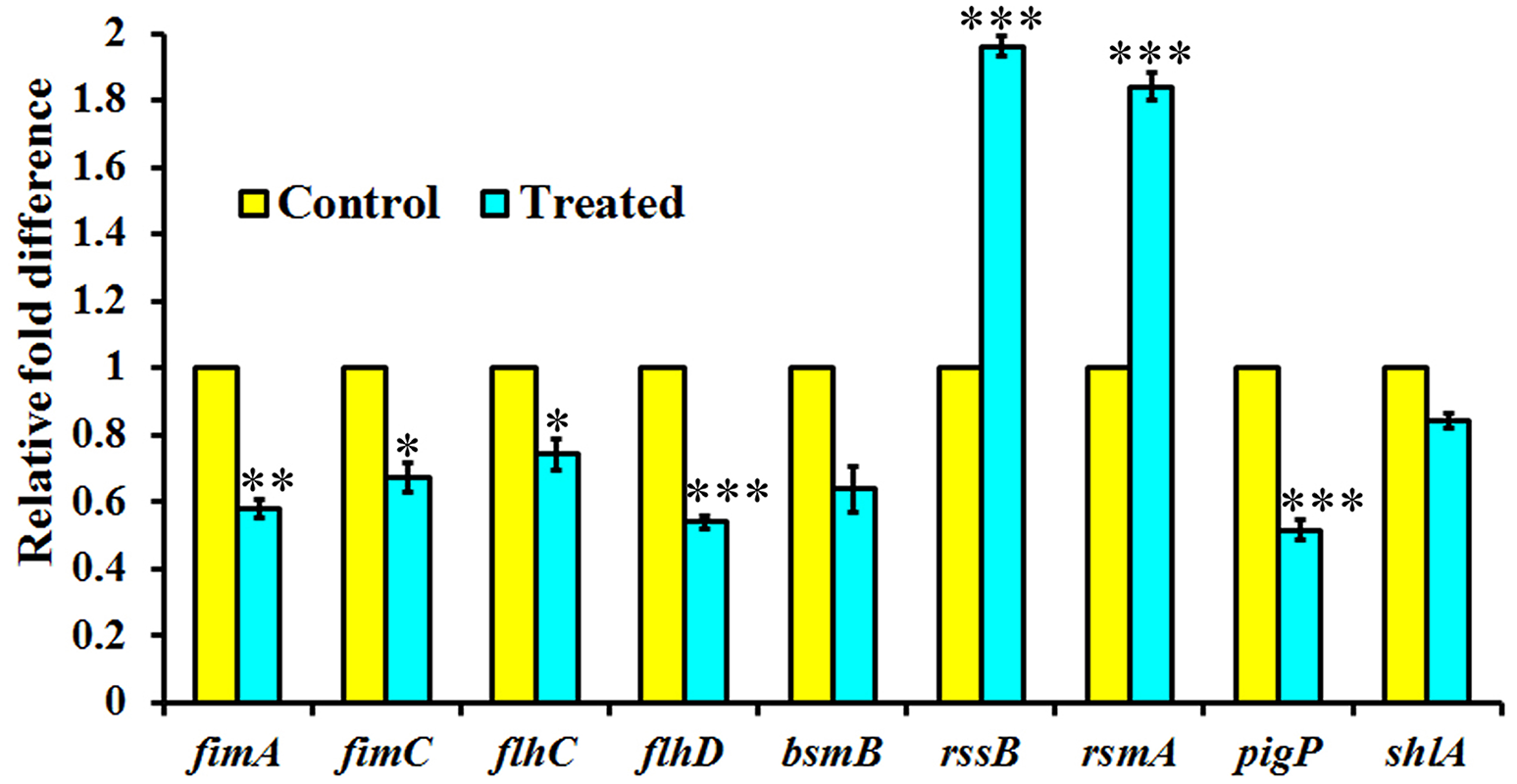 Total RNA was extracted from phytol treated (10 μg/ml) and untreated S. marcescens by TRIzol method and isolated RNA was converted into cDNA using Invitrogen — superscript III kit. qPCR was done on an Applied Biosystems thermal cycler by Power SYBR Green PCR master mix in 7500 Sequence Detection System (Applied Biosystems Inc. Foster, CA, USA). PCR cycles comprised an initial denaturation at 95°C for 10 min followed by 40 cycles of denaturation at 95°C for 45 s; annealing at 57°C for 45 s; extension at 72°C for 50 s. The expression patterns of candidate virulence genes were normalized against rplU gene (housekeeping gene) expression and quantified by calculating 2-ΔCt. Details of the primer sequences of the candidate and housekeeping genes (fimA, fimC, flhC, flhD, bsmB, rssB, rsmA, pigP, shlA, and rplU) used in this study are given in Table 1 and their efficiency was confirmed through 1.5% agarose gel electrophoresis (Supplementary Figure 1) (Salini and Pandian, 2015).