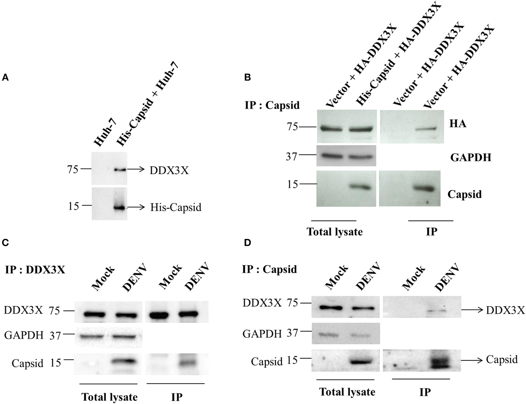 Capsid coimmunoprecipitates with DDX3X from cell lysates. (A) In-solution interaction of purified His-tagged DENV capsid and Huh-7 lysate was followed by pull-down of interacting proteins using Ni-NTA beads. Pull down with Huh-7 lysate alone is used as a control. (B) His-tagged DENV capsid and HA-DDX3X were co-transfected in HEK293T cells. 24 h p.t. lysate was prepared and capsid was immunoprecipitated using DENV capsid antibody. Total lysate and immunoprecipitated proteins were analyzed by western blots probed for capsid, HA and GAPDH. (C,D) Huh-7 cells were infected with DENV at an MOI of 5. At 24 h pi mock and DENV-infected Huh-7 cell lysates were prepared, endogenous DDX3X (C) or DENV capsid (D) was immunoprecipitated from total lysates using DDX3X or DENV capsid antibody respectively. Total lysate and immunoprecipitated proteins were analyzed by western blots probed for capsid and DDX3X.