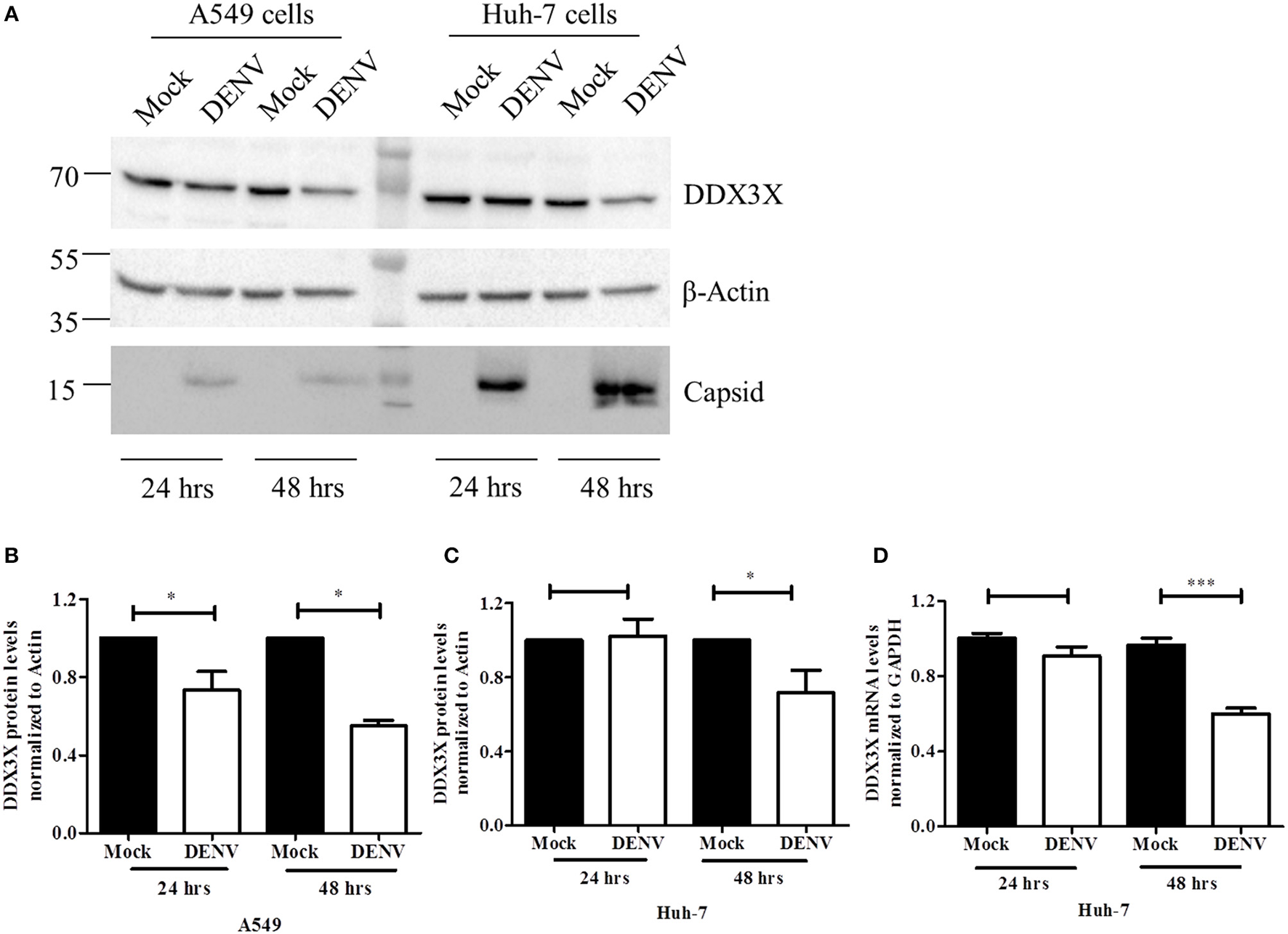DENV down-regulates DDX3X at later stages of infection. A549 and Huh-7 cells were infected with DENV at 3 MOI. Cells were collected at 24 and 48 h pi for either lysate preparation or for total RNA isolation. (A) Cell lysates were used for western blot analysis for DDX3X, GAPDH and capsid in both cell lines. (B). Densitometry quantitation of the blots for A549 cells (n = 4). (C) Quantitation of blots for Huh-7 cells (n = 4). (D) Total RNA was used to estimate mRNA levels of DDX3X by real-time PCR from 3 independent experiments performed in triplicates (n = 9). Data is represented as mean ±SEM. *P < 0.05 and ***P < 0.0005, ns = not significant.