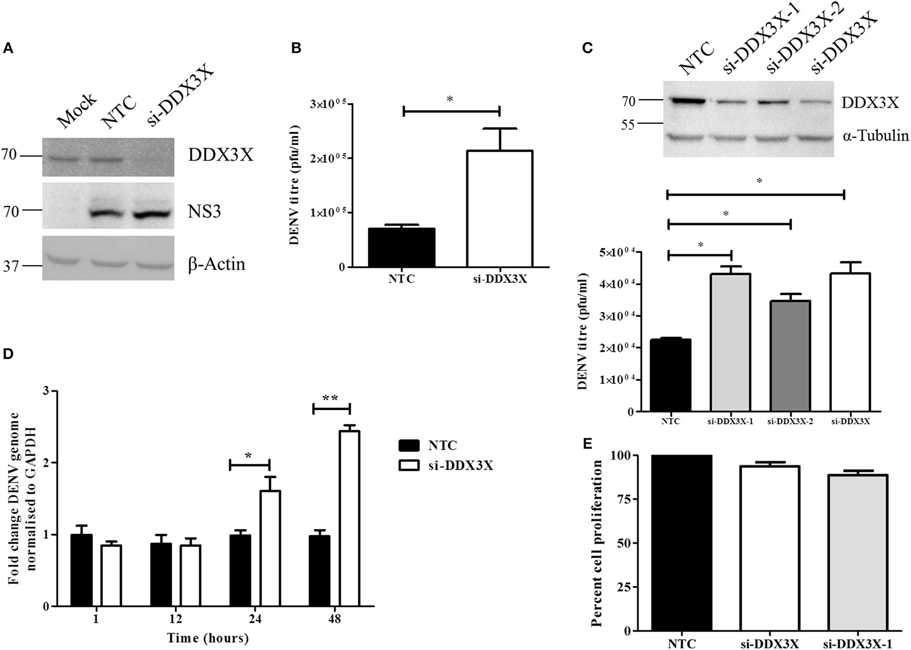 To further assess the role of DDX3X in DENV infection, we performed the knock-down of DDX3X expression using siRNAs in Huh-7 cells. Cells were treated with either DDX3X smart-pool siRNAs or a non-targeting control (NTC) siRNA followed by infection with DENV2. Supernatants were collected at 24 h pi for plaque assay and total RNA was isolated from cells for RT-PCR. Knockdown of DDX3X was confirmed by western blot analysis with cell lysates (Figure 4A). There was about three-fold increase in viral titers in the supernatants of cells where DDX3X expression was knocked down as compared to the NTC (Figure 4B). We further confirmed this observation by using single siRNAs (siDDX3X-1 and siDDX3X-2) to knock-down DDX3X in order to rule out off-target effects of smart-pool siRNAs (siDDX3X). A similar increase in viral titers was observed when individual siRNAs were used to knock-down DDX3X expression (Figure 4C) further confirming that the increase in viral titers is not due to the off-target effect of smart pool siRNAs. The increase in viral titers due to DDX3X knock-down suggested enhanced viral entry, replication or egress due to reduced DDX3X expression. To further identify the stage of DENV life cycle that DDX3X may be involved in, we performed time-course experiments and evaluated the DENV genome levels at 1, 12, 24, and 48 h pi in Huh-7 cells transfected with NTC or DDX3X siRNAs. We observed around 1.4 fold increase in DENV RNA levels at 24 h pi which further increased to 2.5-fold at 48 h pi in DDX3X knock-down cells as compared to NTC (Figure 4D). The viral RNA levels at 1 h pi did not show any difference between si-DDX3X and NTC samples indicating that the effect observed is not due to enhanced viral entry. The knock-down of DDX3X by siRNAs did not affect cell proliferation (Figure 4E). Similar results were obtained with A549 cells where knock-down of DDX3X led to enhanced DENV RNA levels and viral titers as compared to NTC (Figures S5A–D). These results clearly suggest that DDX3X may exert its antiviral effect at a post-entry stage which may have a direct or indirect effect on DENV RNA replication.