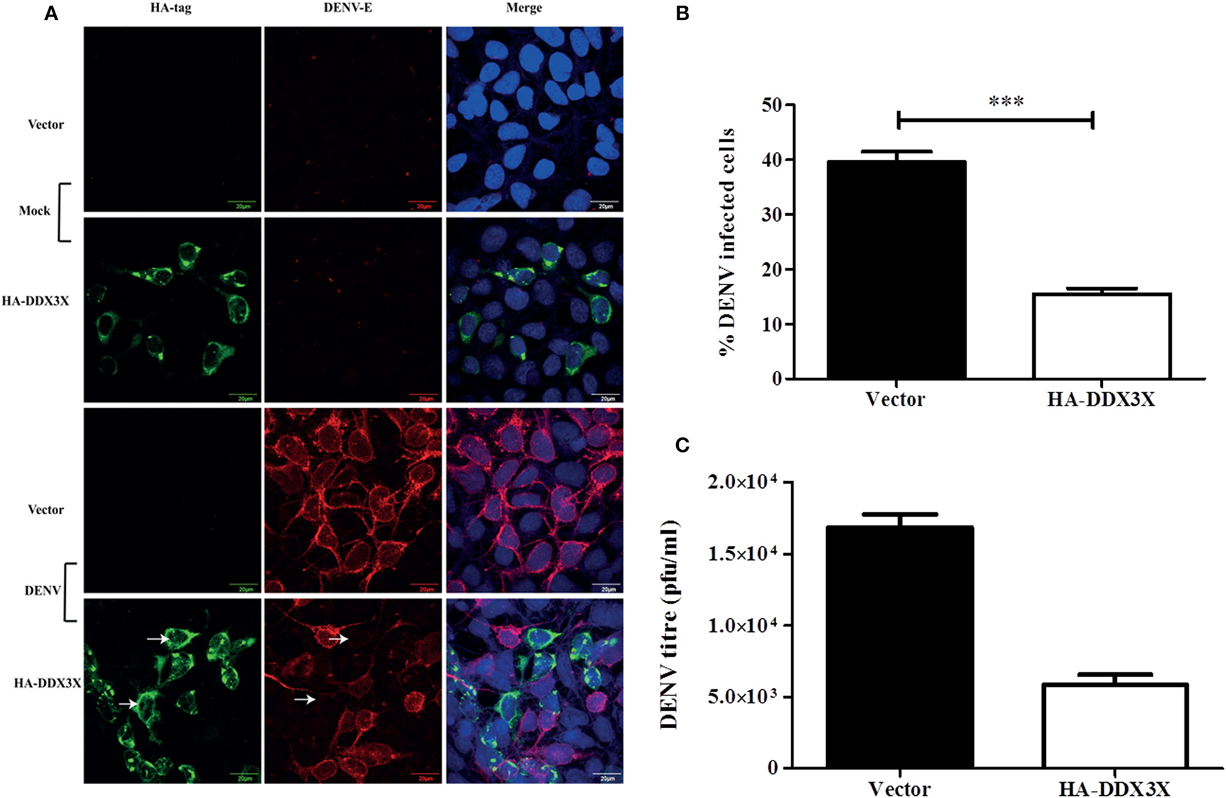 DDX3X overexpression suppresses dengue infection. (A) HA-DDX3X plasmid or the vector was transfected in HEK293T cells. 24 h p.t. cells were infected with DENV at 5 MOI. Cells were fixed and stained for dengue envelope and HA at 24 h pi. (B) Percentage of infected cells was counted in ten fields each in three independent experiments (~3000 cells were counted) (C) Viral titres were estimated by plaque assay at 24 h pi. Data is represented as mean ± SEM. ***P < 0.0005.