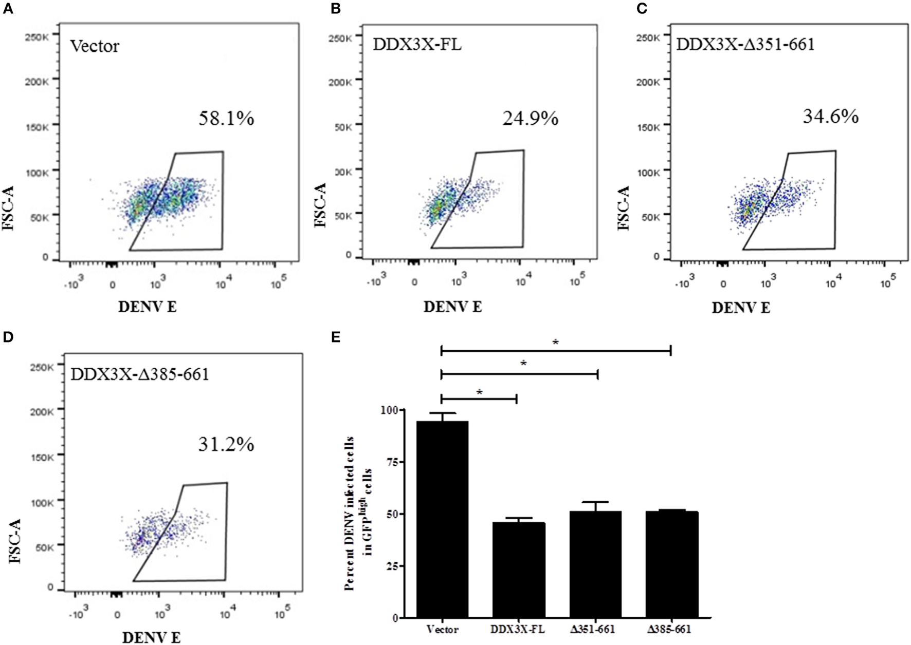 Domain mapping of DDX3X antiviral activity. GFP tagged-DDX3X plasmids were transfected in HEK-293T cells and at 24 h p.t, cells were infected with DENV at 5 MOI. Cells were fixed and stained at 24 h pi with dengue envelope antibody. Cells were acquired in FACS and GFP signal was used to identify transfected cells. (A–D) Representative plots for percent DENV positive in GFPhigh cells for each GFP-DDX3X construct. (E) Quantitation of DENV positivity in GFPhigh for all GFP-DDX3X constructs. The experiment was performed twice with two replicates in each. Data is represented as mean ±SEM. *P < 0.05.