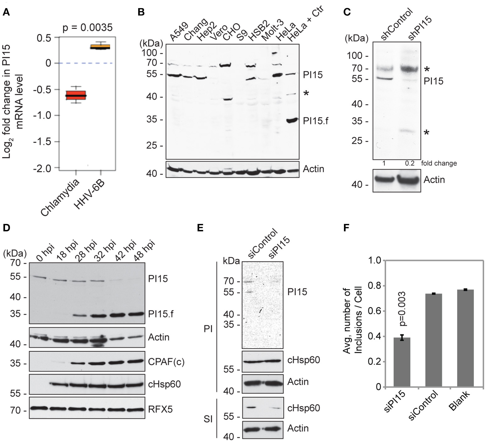 We have previously observed decreased chlamydial growth in presence of human herpesvirus 6 (HHV-6) co-infection (Prusty et al., 2012). To identify host factors that might influence chlamydial growth in presence of HHV-6, we performed a microarray based host cell transcriptome analysis and found PI15 to be differentially regulated during Chlamydia and HHV-6 infection (Figure 1A). The same result was subsequently verified by RT-PCR analysis (Figure S1A). We therefore investigated the role of PI15 during chlamydial infection. Although PI15 expression was observed in various types of animal tissues by in situ hybridization (Smith et al., 2001; Takemoto et al., 2006), the apparent molecular weight of PI15 and its expression dynamics in human tissues is unclear. Hence, we analyzed the expression pattern of PI15 in a wide range of cultured cells by immunoblotting. Instead of the expected mass of ~25 kDa, we detected protein bands at ~55 kDa under various denaturing conditions in majority of cell types including HeLa cells (Figure 1B). As PI15 has a high content of cysteine residues (5% of all amino acids), oligomeric forms of PI15 may form under natural expression conditions by disulfide bond formation. In addition, PI15 possesses a predicted glycosylation site (Yamakawa et al., 1998) and differential glycosylation may contribute to mass differences of the mature protein. Immunoprecipitation (IP) using a monoclonal antibody against PI15 followed by mass spectrometry analysis validated that the observed bands at ~55 kDa were indeed PI15.