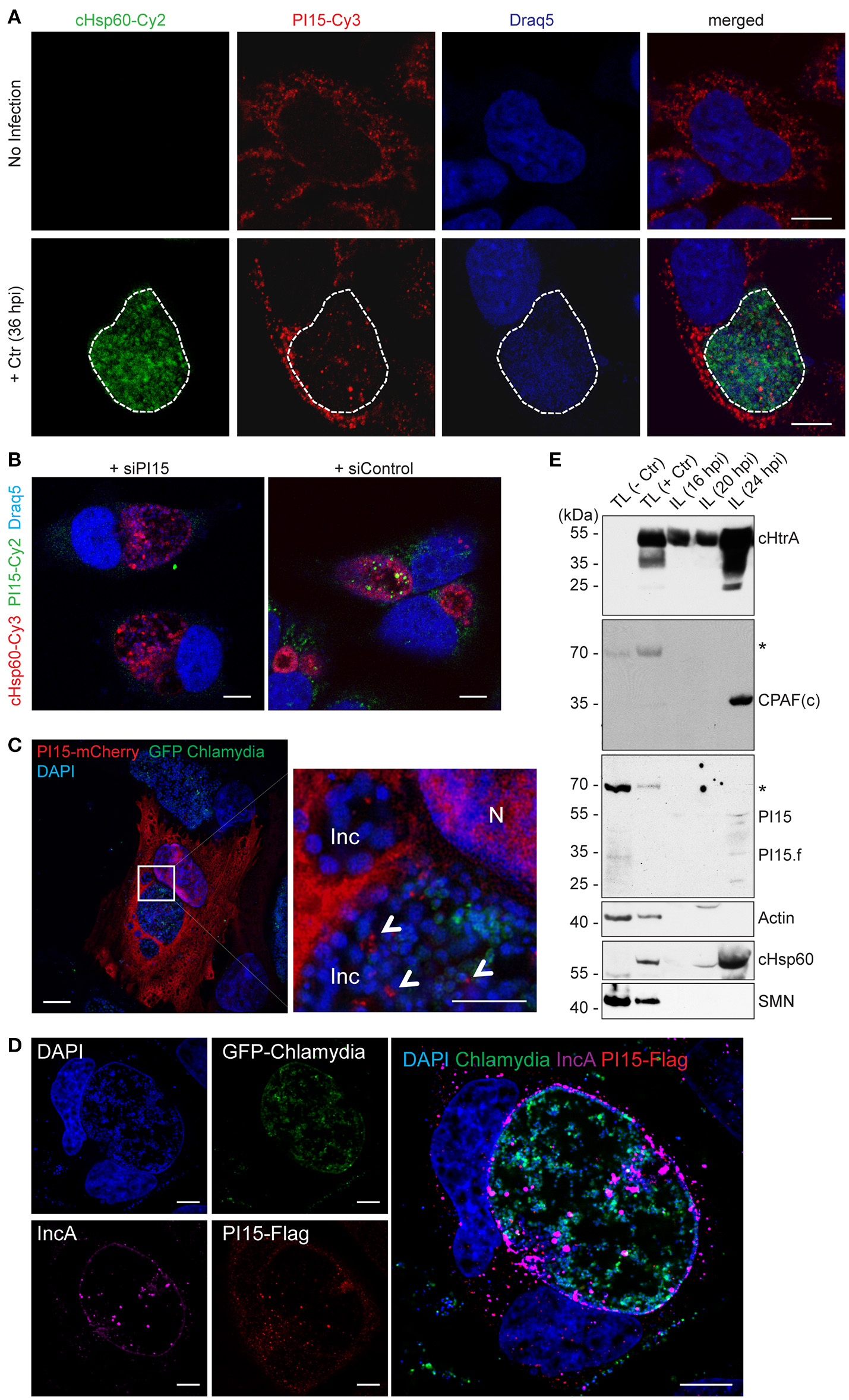 PI15 is recruited into the chlamydial inclusion. (A) PI15 is localized within the chlamydial inclusion. HeLa cells were either left uninfected or infected with C. trachomatis (Ctr) for 24 h. Cells were immunostained using PI15 or Chlamydia-specific Hsp60 (cHsp60) antibodies. Draq5 was used to stain DNA. The chlamydial inclusion is marked with a white dotted line. (B) Validation of the PI15 antibody by RNAi. HeLa cells were either transfected with siRNAs against PI15 or control siRNAs. 72 h post transfection, cells were infected with C. trachomatis. Cells were immunostained as mentioned above. (C) PI15 localizes in the lumen of the chlamydial inclusion. HeLa cells were transiently transfected with a mCherry-tagged PI15 construct. 48 h after transfection, cells were infected with C. trachomatis expressing GFP. Cells were fixed 30 h post infection and stained with DAPI. SIM microscopy was used to study the localization of mCherry-PI15 within the chlamydial inclusion. Inc, inclusion; N, Nucleus. (D) Recruitment of Flag-tagged PI15 to the chlamydial inclusion. HeLa cells were transiently transfected with a Flag-tagged PI15 construct for 48 h and then infected with C. trachomatis expressing GFP. Cells were fixed and immunostained using antibodies against Flag and chlamydial IncA. (E) PI15 was detected within purified chlamydial inclusions. HeLa cells were infected with C. trachomatis for different time intervals. The chlamydial inclusion was purified from the cells and protein lysates (IL) were prepared from purified inclusions. Total cell lysates (TL) from uninfected and 24 h infected cells were used as control. Actin and survival motor neuron (SMN) were detected as markers for cytosol and nuclei to evaluate inclusion purity. hpi, hours post infection. *, non-specific band. Scale bars in all panels, 10 μM.