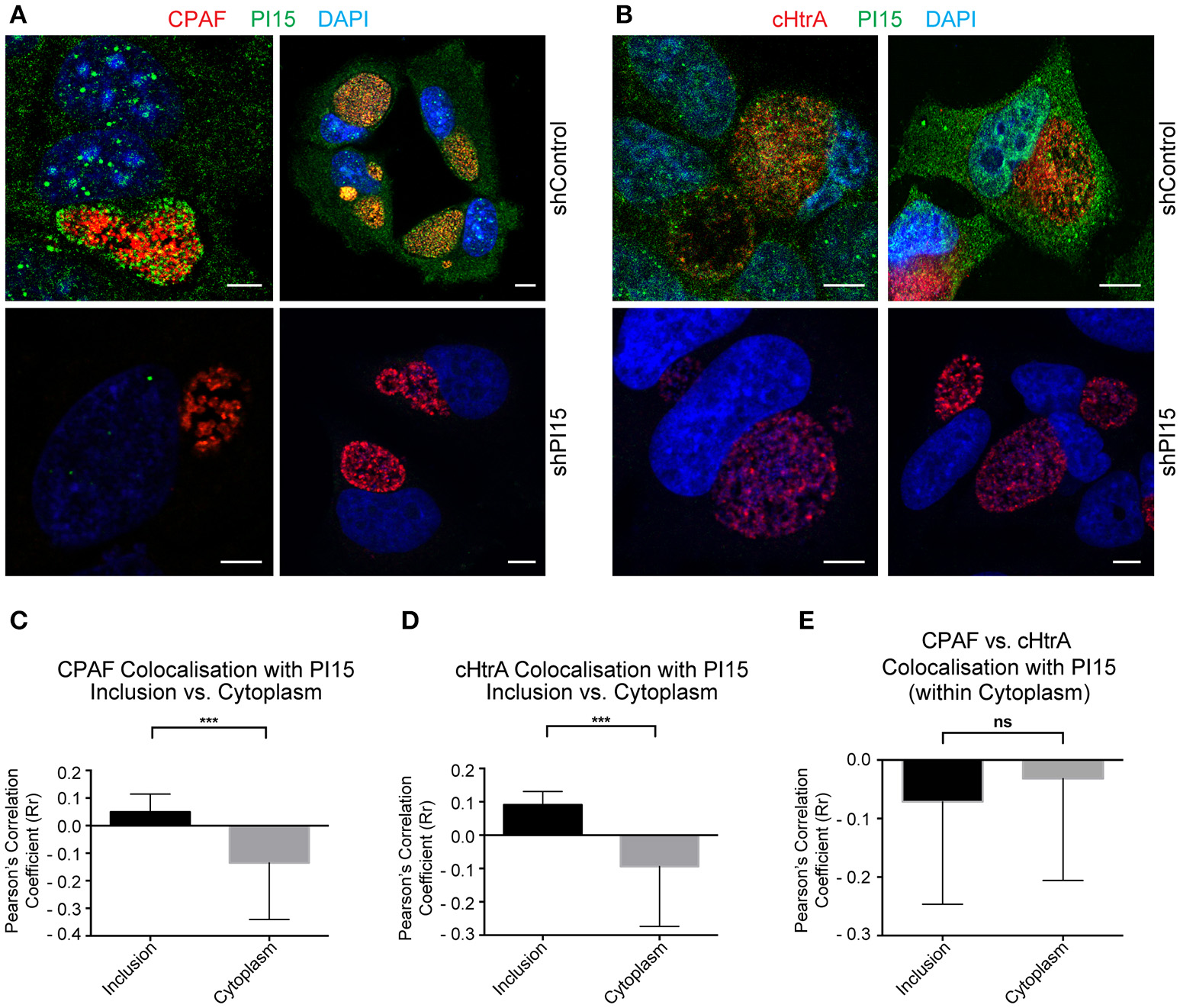 PI15 partially co-localizes with CPAF. (A) Confocal microscopy of HeLa cells showing partial PI15 and CPAF co-localization within inclusion lumen. HeLa cells transduced with control (upper panel) or shPI15-expressing lentiviral vectors (lower panel) were infected with C. trachomatis for 30 h and then immunostained using antibodies against PI15 and CPAF. DAPI was used to stain DNA. Two representative images are shown from different biological replicates. (B) Chlamydial cHtrA and PI15 co-localization was studied under similar infection conditions as in (A). (C) Quantitative analysis of PI15 and CPAF co-localization within chlamydial inclusions and host cell cytoplasm. Confocal images of a Chlamydia infected HeLa cell immunostained as above were used for quantitative analysis. Pearson's overlap coefficient (Rr; representing the degree of overlap between two groups of particles in the image) were obtained by processing confocal images of 38 different Chlamydia infected HeLa cells with ~2 ROI from each picture. (D) Similar analysis was carried out for chlamydial cHtrA. (E) CPAF and cHtrA co-localization with PI15 within the host cell cytoplasm was compared as above. *** ≤ 0.0005. Scale bars in all panels, 10 μM.