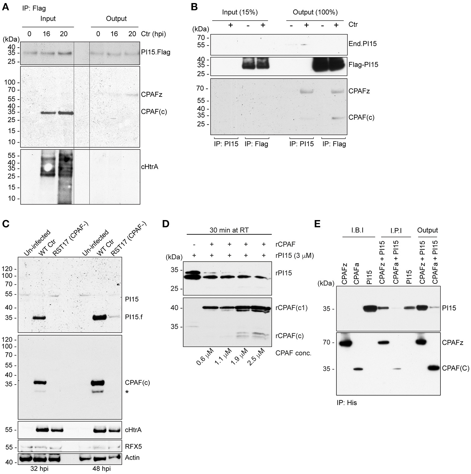 PI15 interacts with the CPAF zymogen. (A) PI15 binds to the CPAF zymogen. Co-immunoprecipitation (Co-IP) experiments were carried out using HeLa cells that were transiently transfected with a PI15-Flag constructs. Cells were infected with C. trachomatis for different time intervals. Total cellular lysates were prepared and used for Co-IP using Flag beads. (B) PI15 interacts with CPAF. Co-IP experiments were carried out using T-REx-293 cells that inducibly express PI15-Flag. Cells were induced with 0.1 μg/ml of AHT for 48 h and then infected with C. trachomatis for another 24 h. Total cellular lysates were prepared and used for Co-IP using either commercial Flag beads or agarose beads with covalently cross-linked PI15 antibodies. (C) Degradation of PI15 depends on CPAF. HeLa cells were infected with Chlamydia wild type or the Chlamydia CPAF mutant RST17 (CPAF−), for 32 or 48 h, respectively. PI15 as well as CPAF expression was analyzed by immunoblotting. Post lysis degradation of substrates by CPAF was monitored by testing RFX5 expression. *, PI15 bands from the previous blot. (D) CPAF cleaves PI15 in vitro. Recombinant PI15 was incubated in the presence of increasing concentrations of recombinant CPAF at room temperature for 30 min and were analyzed by immunoblotting. (E) CPAF interacts with PI15 in vitro. Co-IP was carried out using an inactive full-length recombinant CPAF or active CPAF (both His-tagged) and recombinant PI15 (without any tag). I.B.I., Input samples before incubation; I.P.I., Input after 2 h incubation at room temperature; CPAFz, CPAF zymogen; CPAFa, CPAF active; CPAF(c), c-terminal fragment of active CPAF; CPAF(c1), intermediate c-terminal fragment of active CPAF; End.PI15, endogenous PI15.
