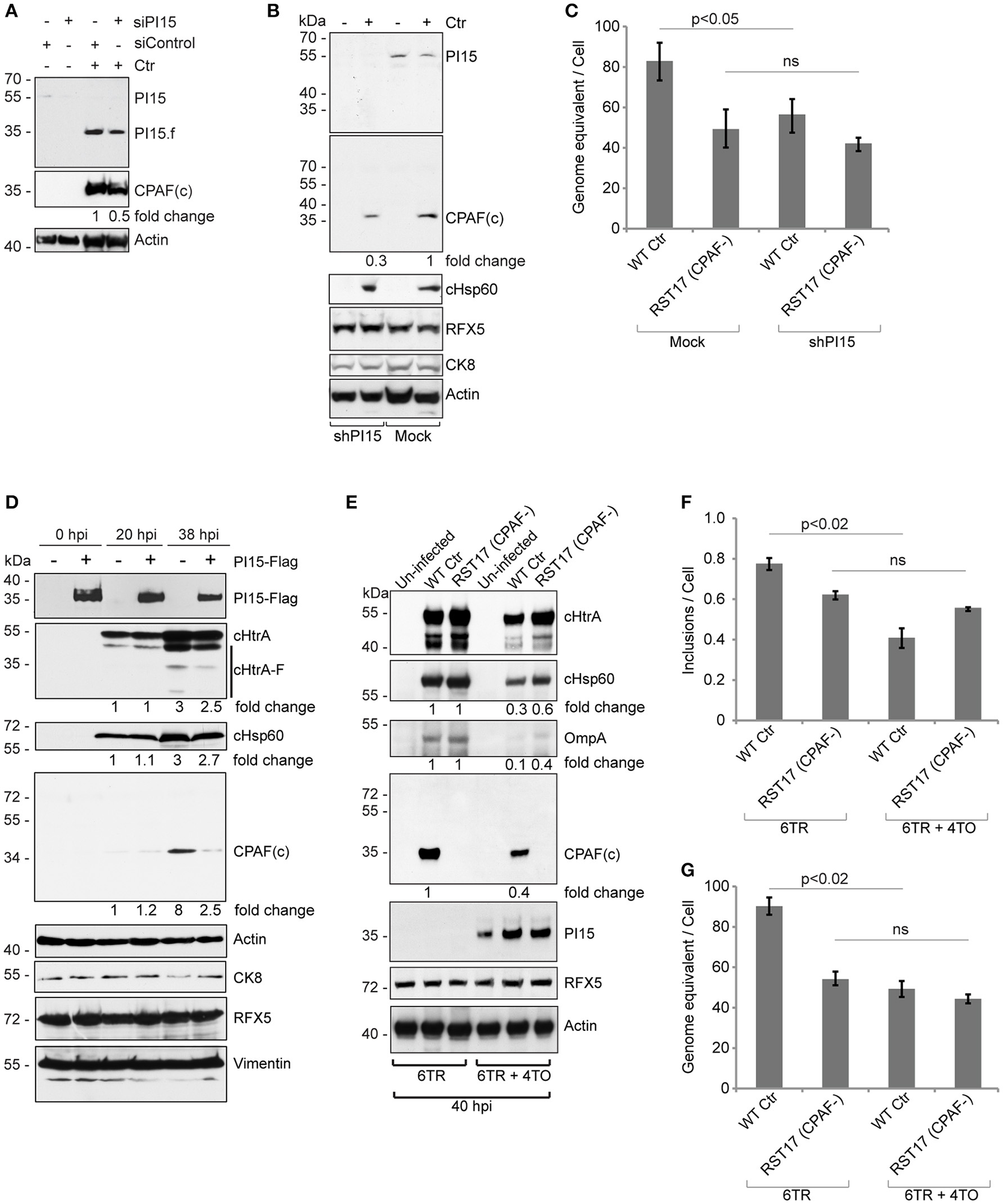 HeLa and 293T cells were grown in RPMI 1640 media and 10% fetal bovine serum (FBS) at 37°C and 5% CO2. T-REx-293 cells (Invitrogen) were grown in presence of Tetracycline negative FBS (Gibco-BRL) and desired antibiotics (Zeocin and/or Blasticidin). For induction of PI15 expression in T-REx-293 cells, cells were cultured with 0.2 μg/ml of doxycycline for 2 days. These cells were washed with PBS twice before Chlamydia infection. All the cell types were generally infected with C. trachomatis (L2) at a multiplicity of infection (MOI) of 1 unless otherwise specified. Chlamydia infectious progeny was determined by using EB preparations for a second round of infection and subsequent quantification of the secondary progeny by both immunoblotting and immunostaining techniques (Prusty et al., 2013). For immunostaining-based progeny calculation, total number of inclusions were calculated within a frame and were divided by total number of cells (counted from DAPI staining) to get the average inclusion numbers per cell.