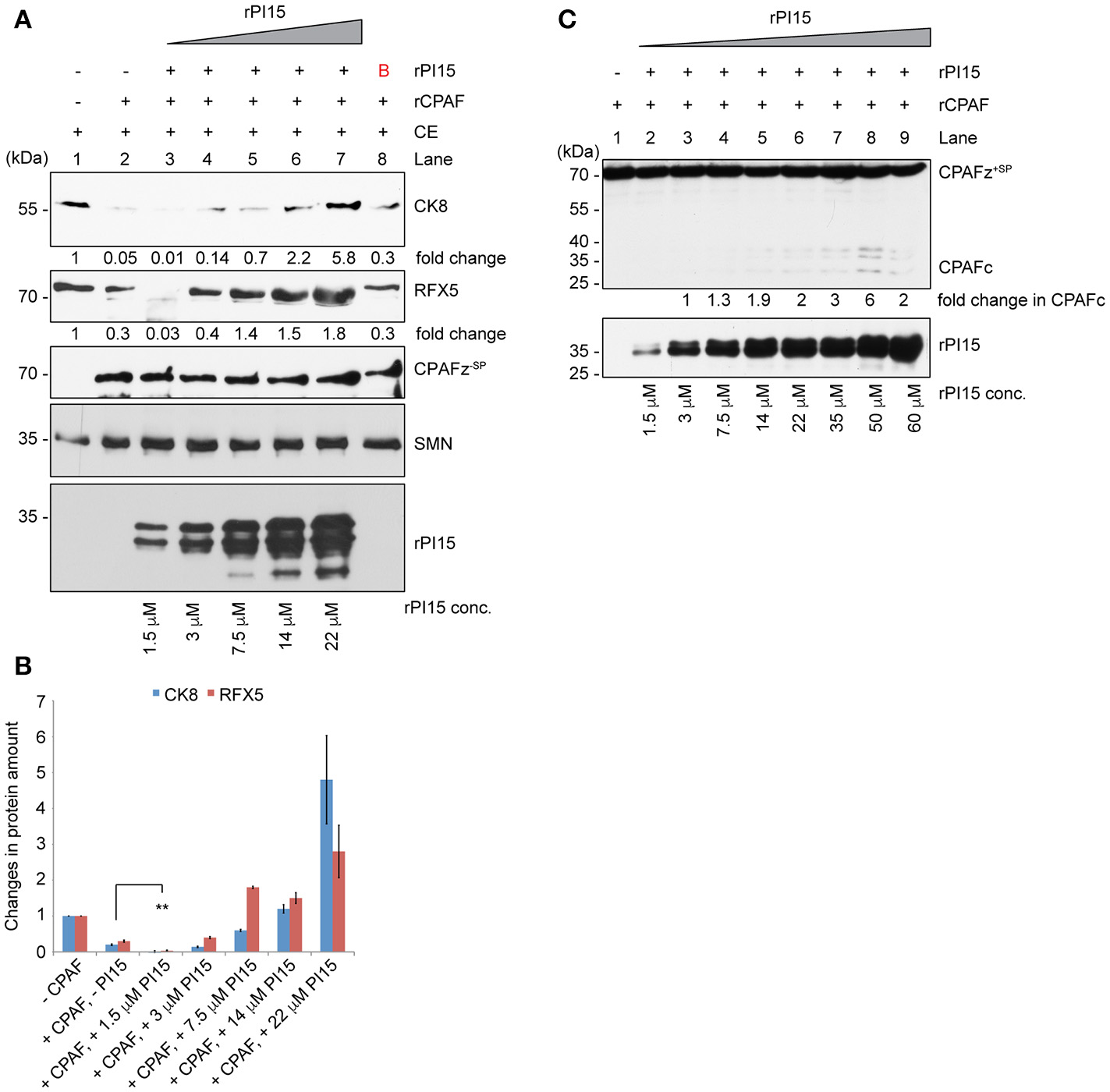 PI15 supports initial CPAF activation. (A) Effect of PI15 on CPAF protease activity was studied in vitro. 60 μg of total cell extract (CE) from HeLa cells were incubated with 1 μM recombinant CPAF zymogen lacking the signal peptide (CPAFz−SP) for 30 min at room temperature in absence or presence of increasing concentrations of recombinant PI15 (rPI15). CPAF protease activity was measured by detecting the CPAF substrates Cytokeratin-8 (CK8) and RFX5 by immunoblotting. SMN and actin were tested as controls as they are not affected by CPAF protease activity and therefore served as loading controls. (B) Unrelated protein. (B) Both CK8 and RFX-5 protein bands were quantified from the above blot. Quantification results from 3 independent experiments were plotted as a bar graph. ** ≤ 0.005 (C) PI15 supports the initiation of CPAF activation. Recombinant CPAF zymogen carrying the signal peptide sequences (CPAFz+SP) was incubated with different concentrations of recombinant PI15 (rPI15) for 30 min at room temperature. CPAF and PI15 were detected by immunoblotting.
