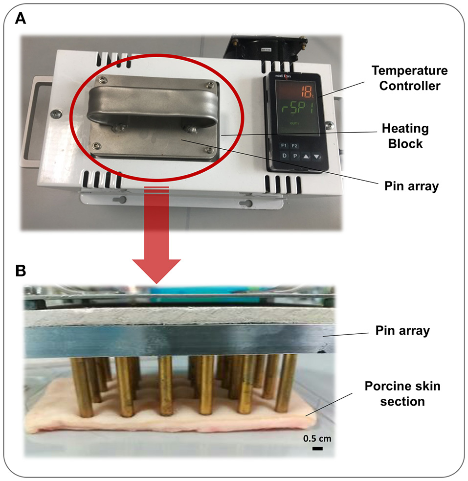 Burn Wound Array Device. The Burn Wound Array Device consists of an array of 24 brass pins that rests in a temperature controlled heated block. Pins are heated to the set temperature and the device signals the user when this has been reached and tool is ready for use. (A) Heated block and temperature controller with 24 pin array inserted and heating. (B) 24 pin array resting on a section of porcine skin to generate thermal injuries.