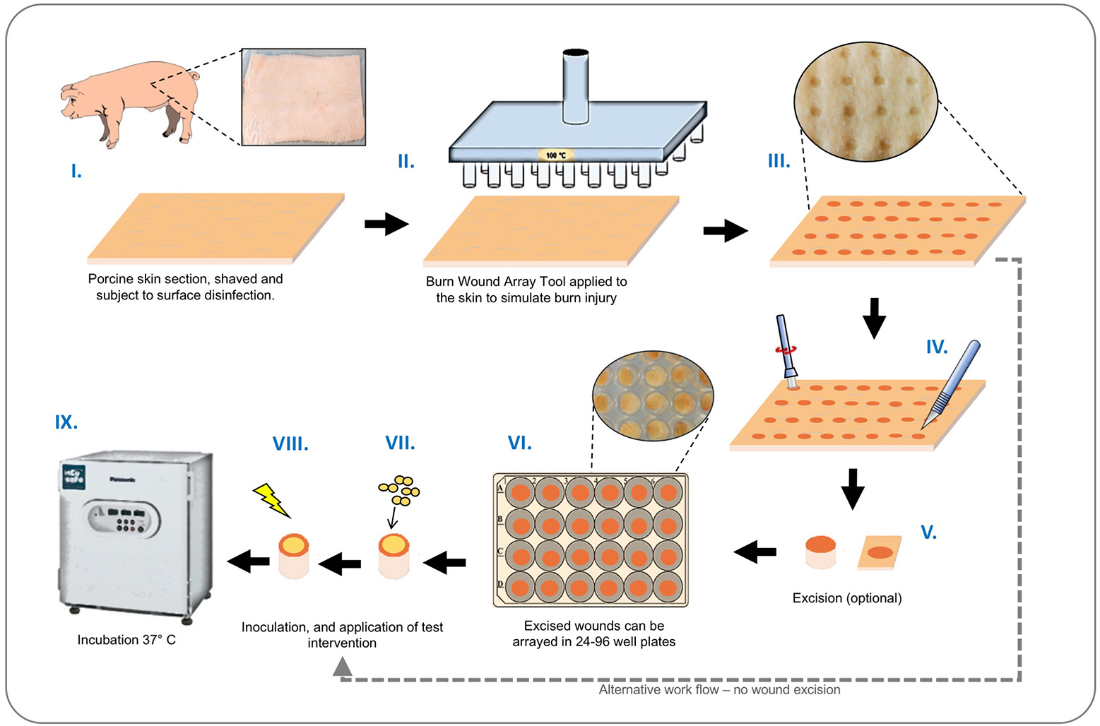 The study of biofilm formation in burn wounds and the evaluation of methods to control these infections is often limited by access to relevant and appropriate models. In particular, early stage laboratory studies aimed at screening and developing new antimicrobial or anti-biofilm agents, or providing fundamental molecular genetic insights into bacterial biofilm formation in wounds, are often hampered by a lack of models which afford both reasonable throughput yet provide a good representation of biofilm formation in burn wounds. Ideally, such models should also be low-cost and simple to operate, support high throughput screening, offer good reproducibility, and be compatible with a wide range of established techniques for measuring or visualizing various aspects of microbial physiology, growth, biofilm formation, and gene expression.