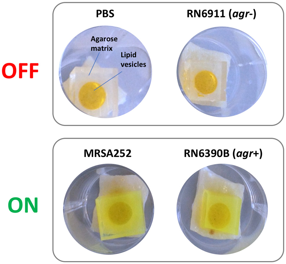 Activation of infection responsive dressings. Examples of non-activated (OFF) and activated (ON) prototype infection responsive dressings originally described by Thet et al. (2015). Dressings consist of carboxyfluorescein loaded lipid vesicles embedded in an agarose matrix. At high concentrations in vesicles, carboxyfluorescein exhibits self-quenching properties that suppresses visible color. Lysis of vesicles by bacteria liberates the dye which diffuses through the dressing leading to development of a bright green color visible to the naked eye. In examples above, dressings incubated for 6 h in wound models with PBS or S. aureus RN6911 (which is deficient in the Accessory Gene Regulator agr), show no dressing activation. In contrast, dressings incubated with MRSA252 and RN6390B (parental strain of RN6911 with functional agr) show clear dressing activation.