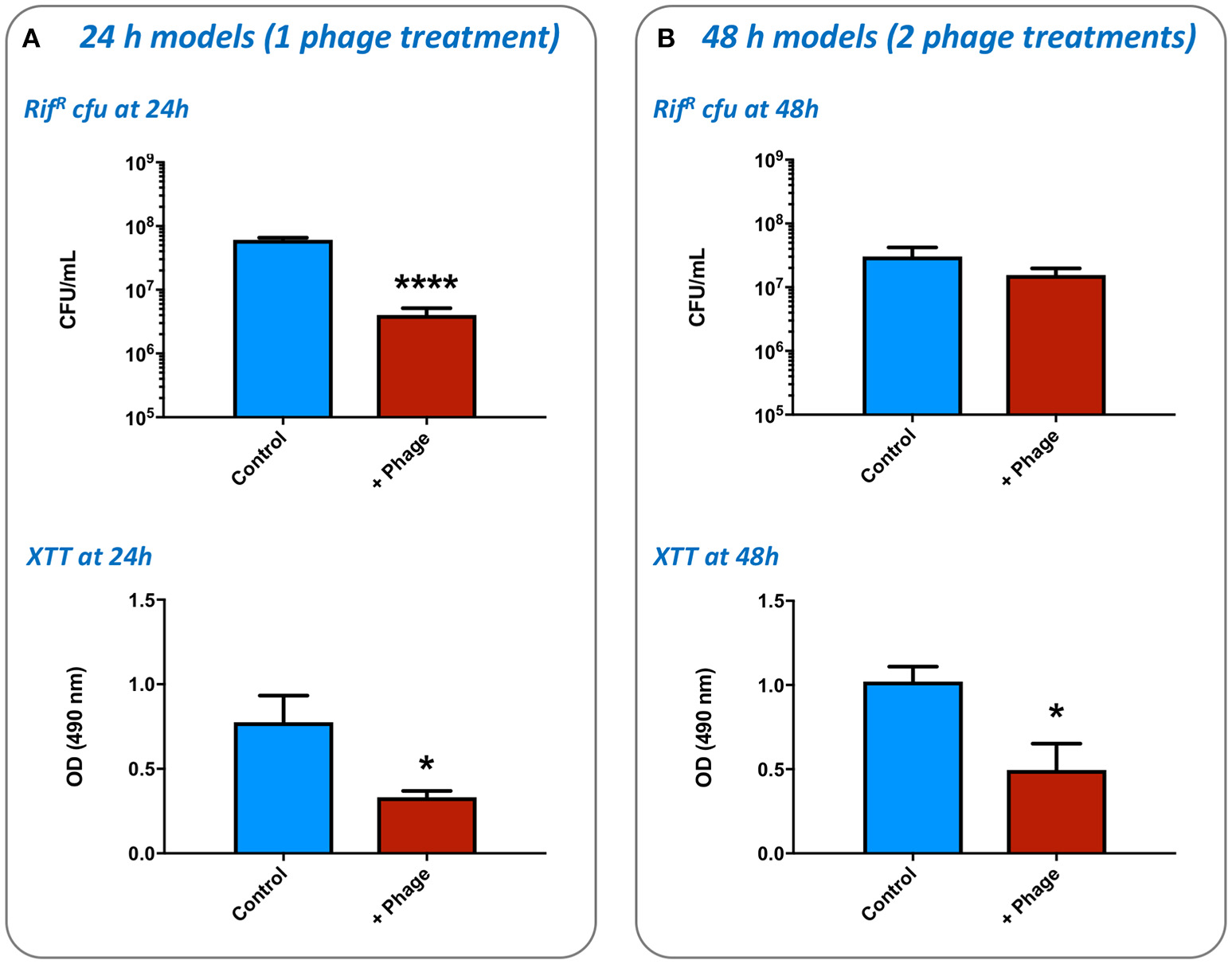 To determine the growth of S. aureus within the wound, and the impact of phage treatment on these simulated wound infections, numbers of viable RifR cells were enumerated, and levels of bacterial metabolic activity in wounds measured by the XTT assay. The application of a single dose of phage at 4 h post-inoculation (1:1 of each phage) was shown to result in a significant reduction in numbers of RifR cells and overall metabolic activity compared with untreated controls, after models had run for 24 h (Figure 6A). Enumeration of phage present in these wounds after 24 h also showed higher numbers were present in the wound than originally inoculated (17.25-fold increase) indicating phage replication. In wounds subject to a second phage treatment 24 h after wound inoculation (and run for a total of 48 h), phage treatment did not result in a significant drop in numbers of RifR cells as measured by viable cell counts (Figure 6B), but overall metabolic activity remained significantly reduced in phage treated wounds (Figure 6B). The number of phage recovered from 48 h models was also considerably higher than the cumulative titer of phage applied to these models at the 4 h and 24 h time points (64.64-fold increase), as well as the titer of phage recovered at the end of 24 h models (41.10-fold higher at 48 h vs. 24 h), indicating phage continued to replicate in models run for longer periods of time.