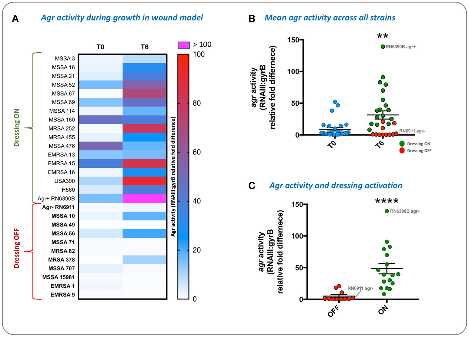 Evaluation of agr activity and activation of infection-responsive dressing materials. To understand how S. aureus virulence gene regulation was influenced by growth in the porcine wound model, and relate this to activation of prototype infection responsive dressings, the activity of the Accessory Gene Regulator (agr) was measured in 28 strains (Table 1). Agr activity was assessed by qRT-PCR of RNAIII relative to the housekeeping gene gyrB. (A) Heatmap showing RNAIII:gyrB relative gene expression in each strain between time points assessed: Initial inoculum (T0) and after 6 h in growth in wound models (T6). Shading of cells indicates fold-difference in RNAIII:gyrB expression as indicated by the associated scale. Strains in bold denote those not activating the prototype dressing during the assay. (B) Shows mean RNAIII:gyrB relative expression in all strains, in initial inoculum (T0) and after 6 h growth in wound models (T6). (C) Shows mean RNAIII:gyrB relative expression after 6 h growth in models for strains activating prototype infection-responsive dressings (ON), compared to strains that did not elicit a color change in dressings (OFF). Examples of activated and non-activated dressings are provided in Figure 3. All values show the means of three replicate experiments. Error bars show standard error of the mean. **P ≤ 0.02, ****P < 0.0001.