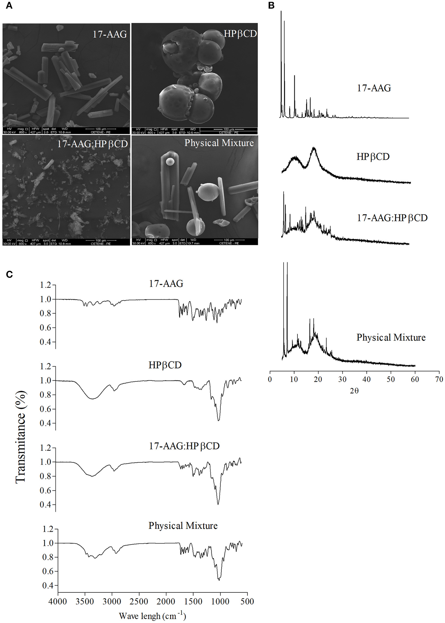 Characterization of the 17-AAG:HPβCD inclusion complex. (A) SEM of 17-AAG; HPβCD; 17-AAG:HPβCD and the physical mixture. Magnification: 600 X. (B) X-ray diffraction patterns of 17-AAG; HPβCD; 17-AAG:HPβCD and the physical mixture. (C) FT-IR spectra of 17-AAG; HPβCD; 17-AAG:HPβCD and physical mixture.