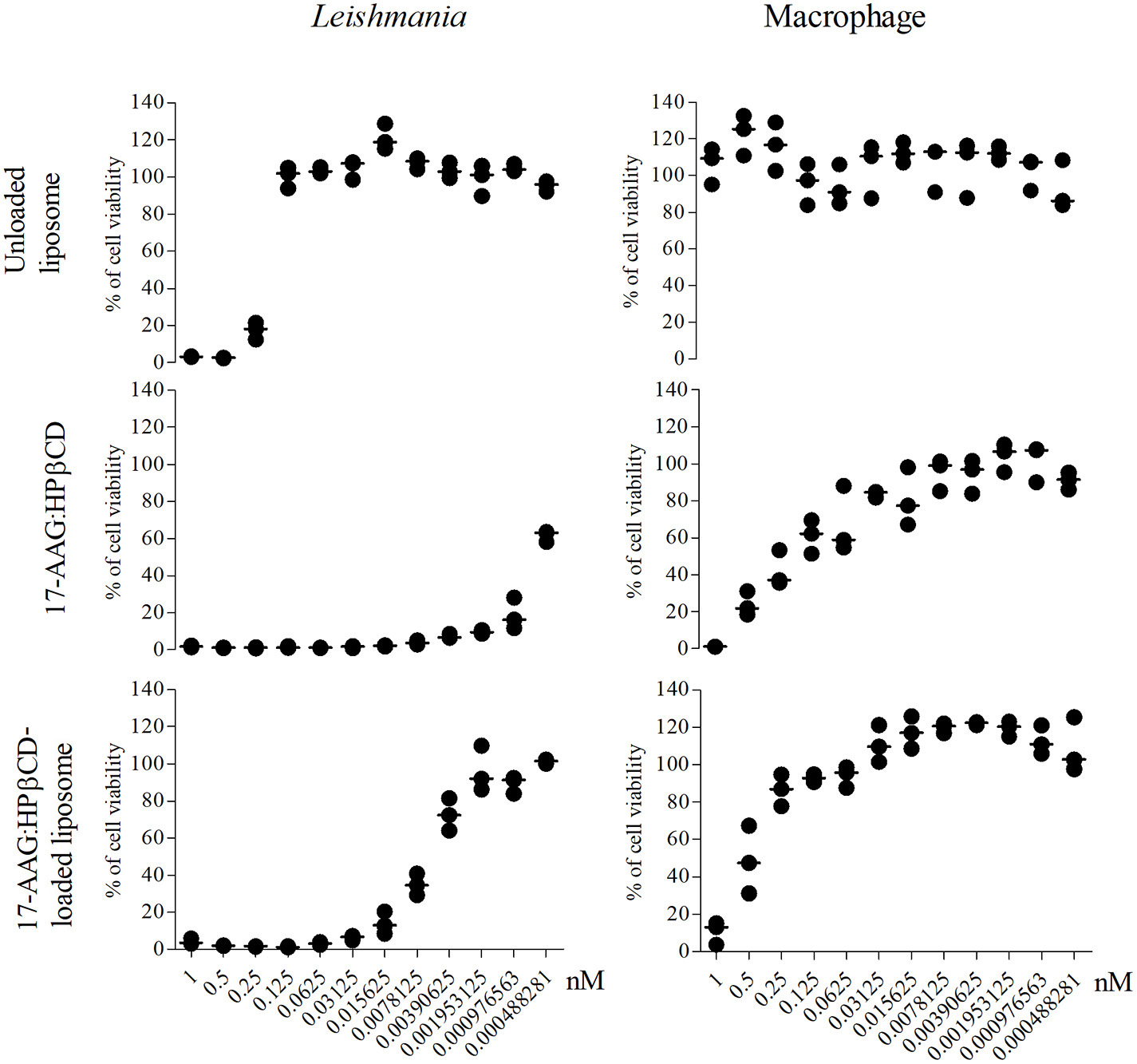 Nanoformulations of 17-AAG reduced the viability of axenic Leishmania promastigotes. Macrophages and log-phase promastigotes of L. (L) amazonensis were treated with 12-step serial dilutions (1:2) of unloaded liposomes; 17-AAG:HPβCD inclusion complex and 17-AAG:HPβCD-loaded liposomes for 72 h. Each graph is representative of one out of three experiments performed in triplicate. Lines are representative of median values from a single experiment.