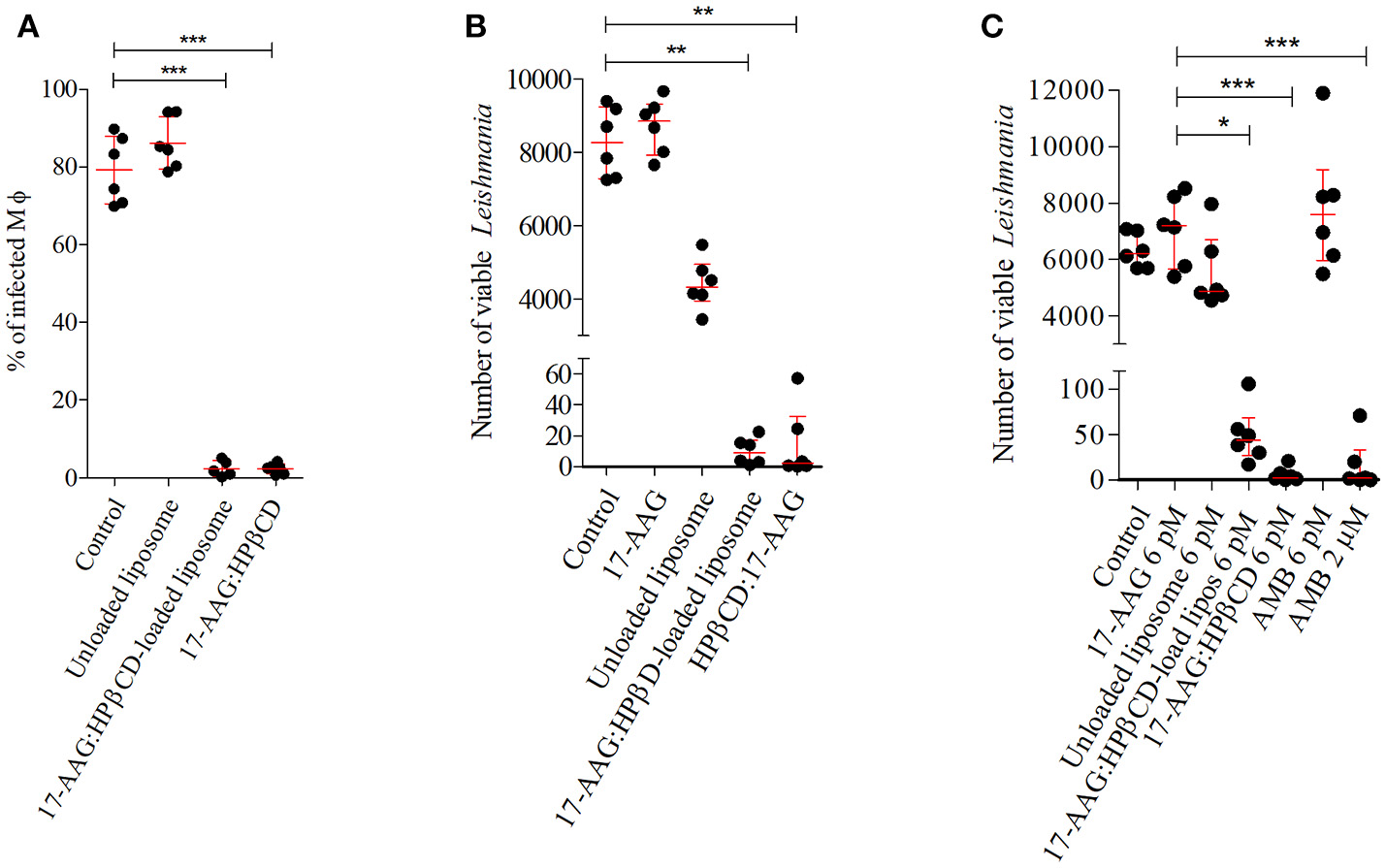Effect of 17-AAG nanoformulations on intracellular L. (L) amazonensis. (A) Percentage of infected macrophages at earlystage of infection. Infected macrophages were treated with 0.006 nM of unloaded liposomes; 17-AAG:HPβCD inclusion complex and 17-AAG:HPβCD-loaded liposomes for 48 h. Cells were fixed, DAPI stained and analyzed under fluorescent microscopy. At least 400 cells were counted per coverslip. (B) Intracellular parasite viability at very early stages of infection. Macrophages were infected for 6 h and then treated with 0.006 nM of 17-AAG:HPβCD-loaded liposomes compared to controls: pure 17-AAG; unloaded liposomes; 17-AAG:HPβCD for 48 h. (C) Intracellular parasite viability at later stages of infection. Macrophages were infected for 72 h and then treated with 0.006 nM of the following compounds: 17-AAG, unloaded liposomes, 17-AAG:HPβCD, 17-AAG:HPβCD-loaded liposomes and AMB, and 2 μM AMB for 48 h. (A) Dots represent individual replicates for a group of treated macrophages. Lines represent means ± SD of one representative experiment out of three performed in sextuplicate (one-way ANOVA, Dunn's Multiple Comparison Test, ***p < 0.0001). (B,C) Dots represent individual replicates for a group of treated macrophages. Lines represent median ± interquartile range (25% and 75%) for one representative experiment out of two performed in sextuplicate (Kruskal-Wallis test, Dunn's Multiple Comparison test, *p < 0.05, **p < 0.01, ***p < 0.001).