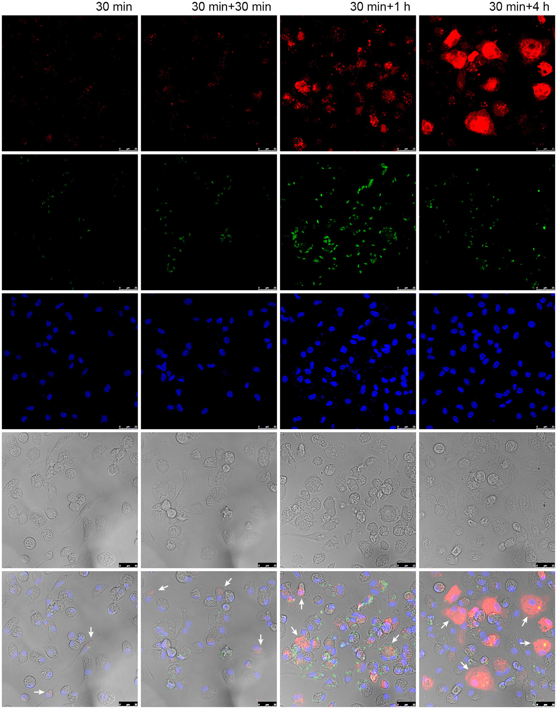 Inflammatory peritoneal macrophages were obtained as described above and plated at a concentration of 105 cells per well on a 24-well plate with glass coverslips. Prior to macrophage infection, L. (L) amazonensis parasites were stained with carboxyfluorescein (CSFE) to obtain green fluorescent parasites. Briefly, 108 parasites were incubated in 4 mL of saline solution with 1 μM of CFSE for 10 min at 37°C. Next, 4 mL of FBS was added and reincubated for an additional 1 min. The parasites were then washed thrice and the plated macrophages (10:1) were infected for 4 h. All plates were subsequently washed to remove any non-internalized parasites and then reincubated for an additional 72 h. Next, cells were treated with fluorescent liposomes for 30 min, washed and then a group of cells was fixed with 4% paraformaldehyde for 20 min at room temperature. Three other groups were then reincubated for an additional 30, 120, or 240 min, followed by fixing. Coverslips were then mounted on slides using ProLong Gold with DAPI for nuclear staining. Images were captured on a Leica SP8 confocal microscope. Fluorescence and differential interference contrast (Panzitta et al., 2015) images were acquired using resonant scanning mode at a resolution of 1,024 Ă— 1,024 under magnification (63 Ă—) with an oil immersion objective and z-stacks ranging from 0.3 to 0.5 μm.